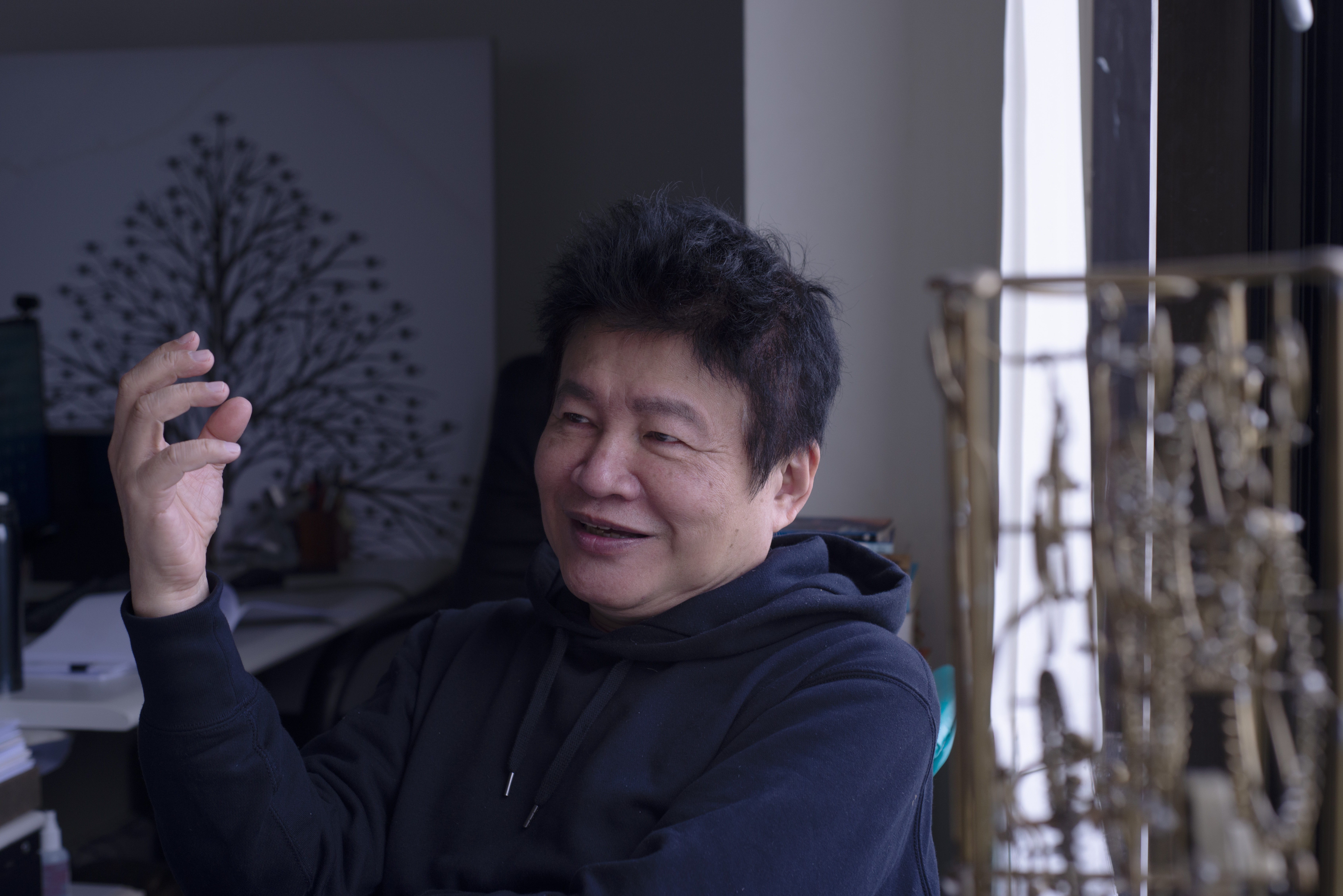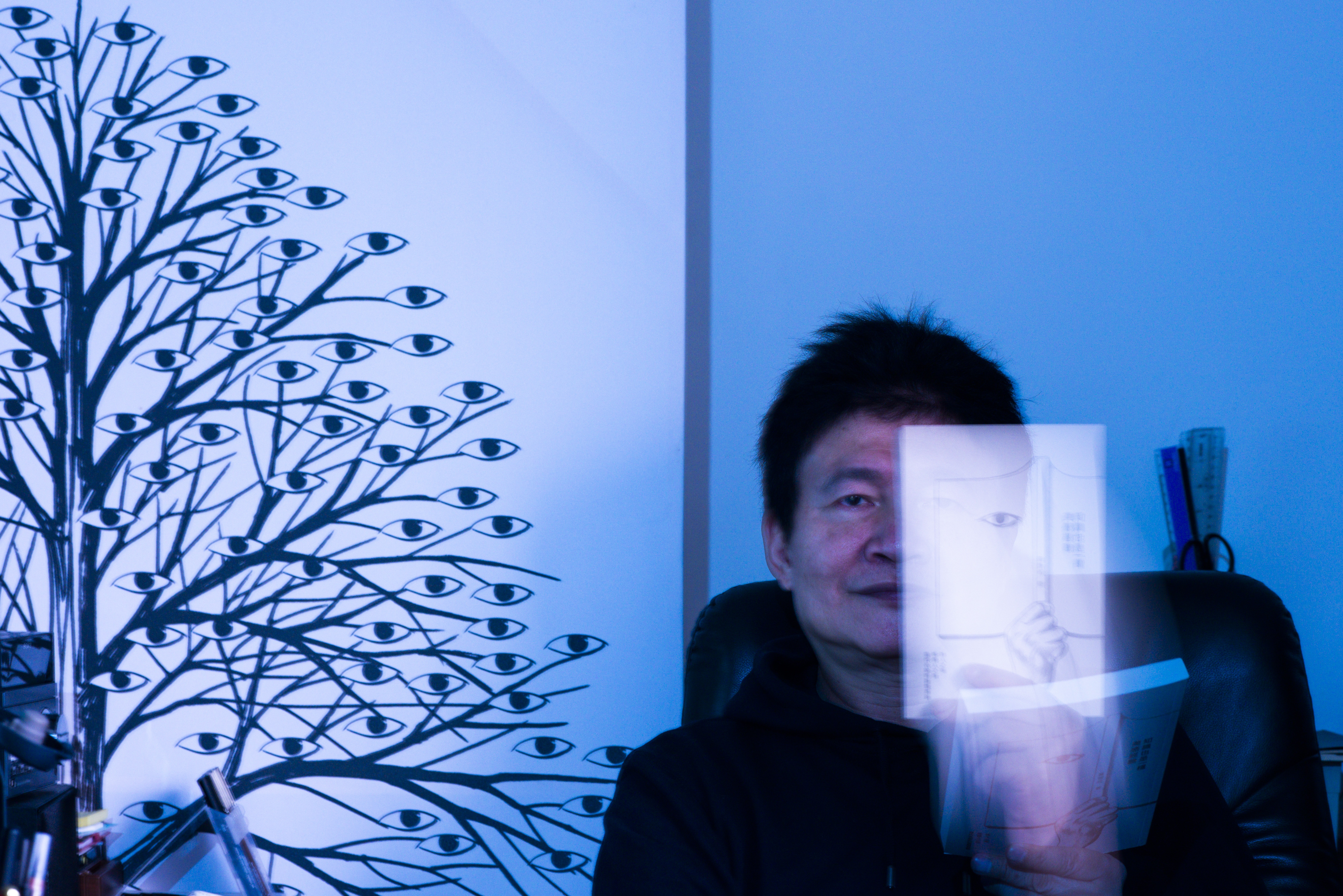 他的辦公座位後面,放著大型輸出的一樹眼睛。是2017年的「世界停電我獨舞」詩畫特展主視覺,也作為2018年再版的《黑色鑲金》書封。