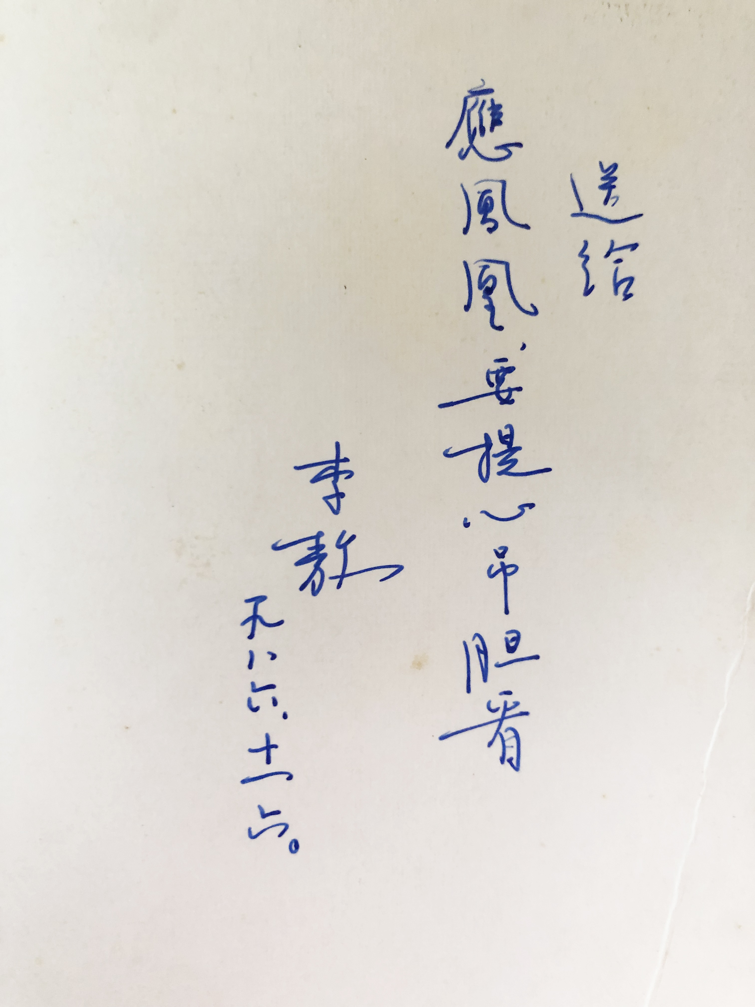 2.《李敖回憶錄》一書,李敖題字:「長河砥柱,人海慈航,斯文在茲,送給鳳凰。」