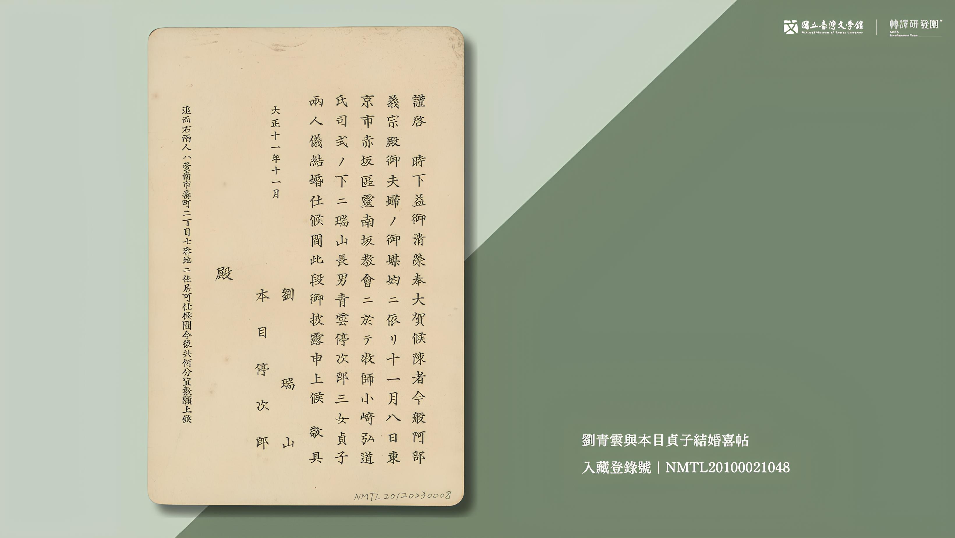 1920年代臺南市富商劉瑞山之子劉青雲,日本慶應大學畢業後,與日人本目貞子結婚,此為未寄之喜帖。(藏品/劉青雲家屬捐贈,圖/國立臺灣文學館)