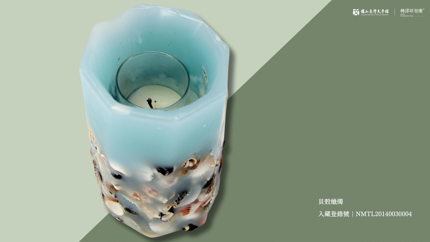 此件器物為作家張曉風於2000年訪美時,寄至南加州贈送給當時正在做復健的張秀亞。蠟燭中鑲嵌了各式貝殼,十分美觀,恰可呼應張秀亞的詩作〈貝殼〉。(藏品/于金山&于德蘭捐贈,圖/國立臺灣文學館)