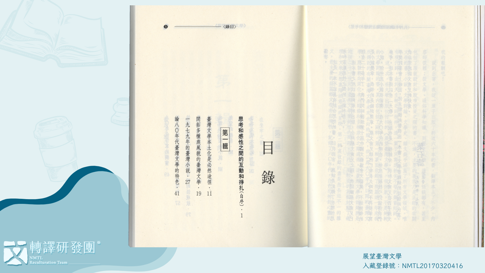《展望臺灣文學》目錄,民國1994年8月發行。全書分為兩輯,富自傳性色彩的散文收錄於第二輯,本文轉譯內容便取材自其中〈噶瑪蘭的淒風苦雨〉、〈放逐〉、〈甕中之鱉〉等篇章。(藏品/葉石濤捐贈,圖/國立臺灣文學館)
