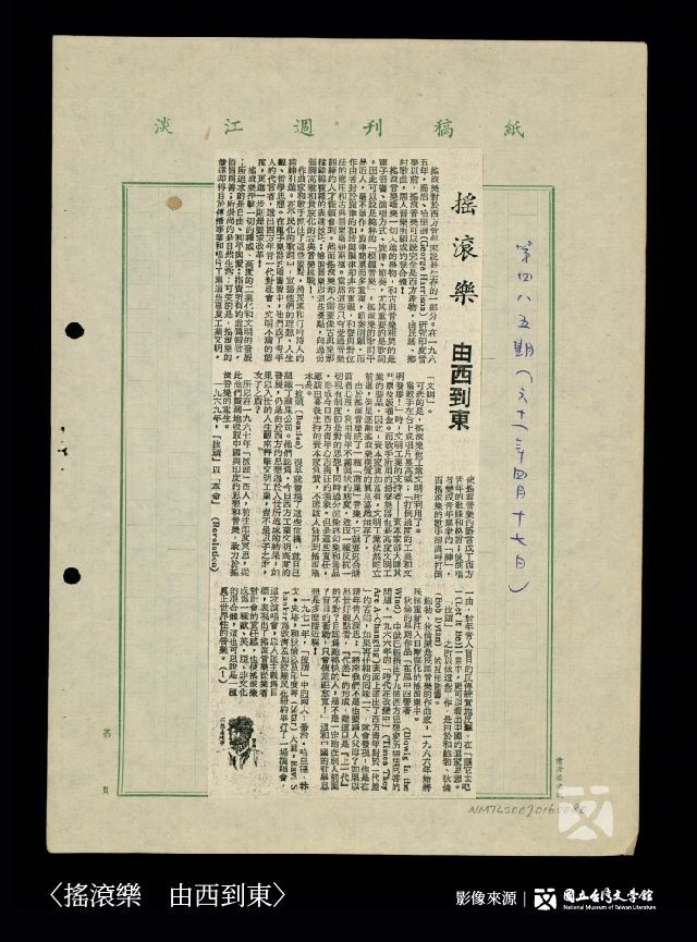 〈搖滾樂    由西到東〉剪報。(藏品/李雙澤紀念會捐贈,圖/國立臺灣文學館