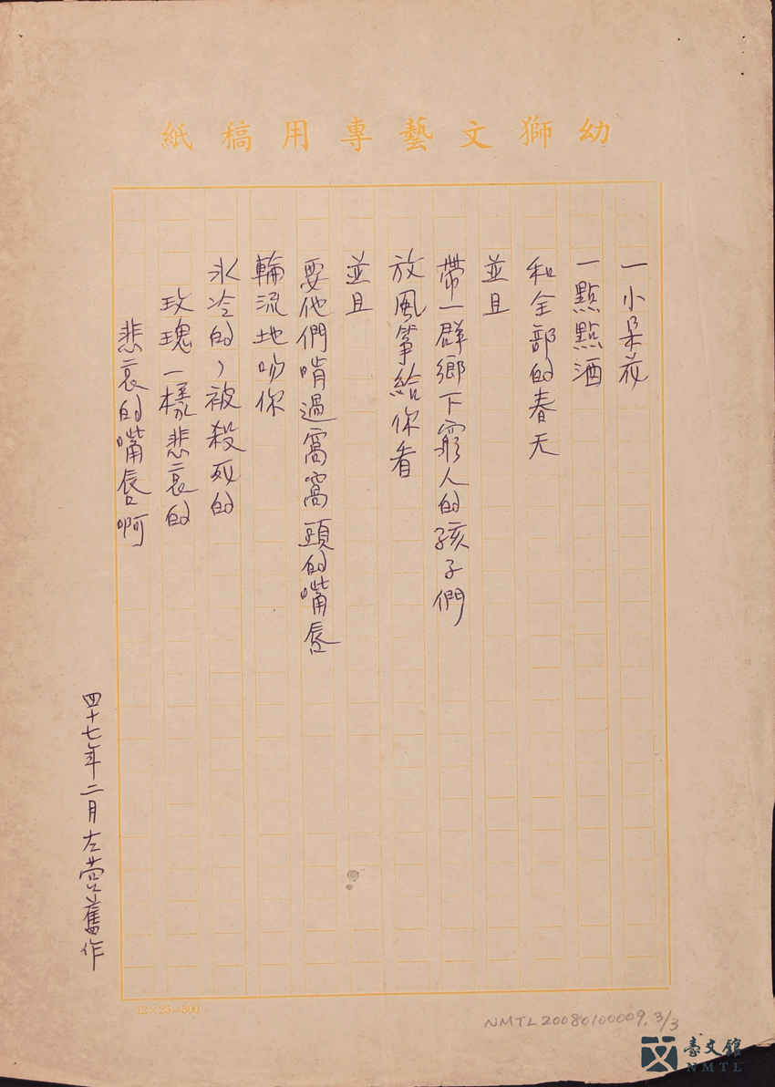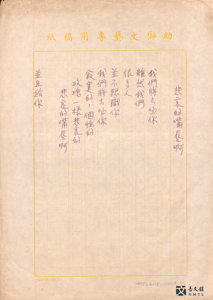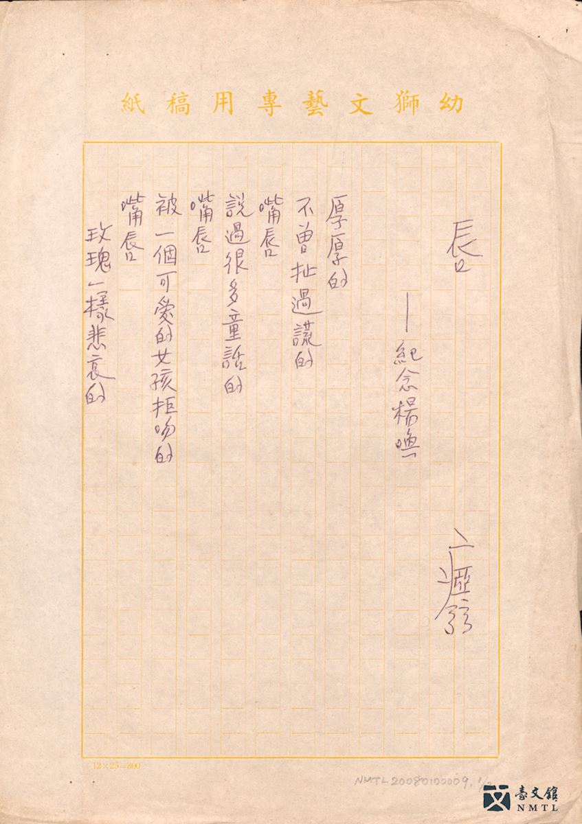 ▸ 瘂弦〈唇──紀念楊喚〉手稿|瘂弦為紀念因故過世的詩人楊喚(1930-1954),於1958年2月創作本詩。瘂弦以「唇」為連結的元素,寫出對文友楊喚人格與其對兒童文學貢獻的肯定及不捨:「厚厚的╱不曾扯過謊的╱嘴唇╱說過很多童話的╱嘴唇……」
