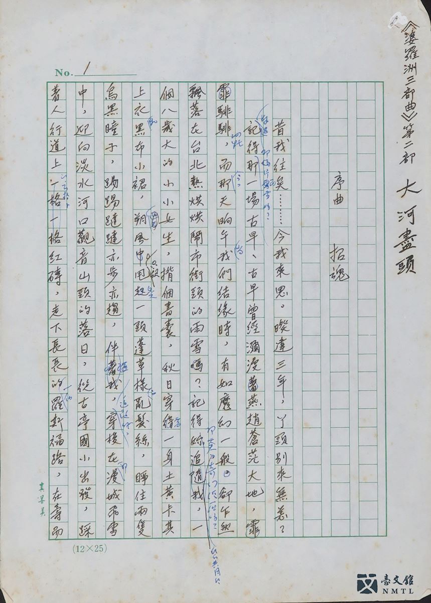 ▸ 李永平《大河盡頭》「序曲」手稿|李永平(1947-2017)長篇小說《大河盡頭》「序曲」手稿。李永平生於婆羅洲砂嶗越,後定居臺灣,作品探討婆羅洲、中國與臺灣的身份及文化認同等,著有《吉陵春秋》、《海東青》、《朱鴒漫遊仙境》、《朱鴒書》等。