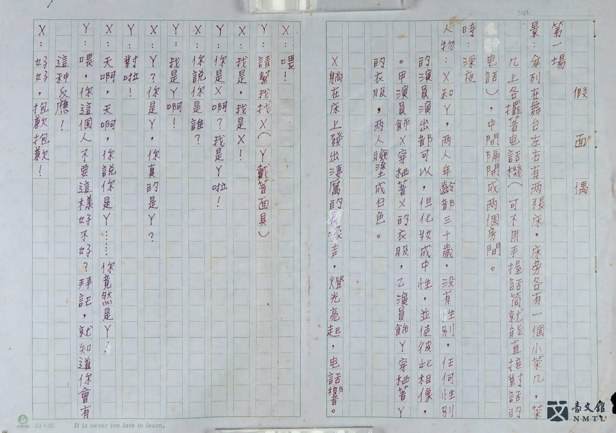 ▸ 邱妙津〈假面偶〉手稿|邱妙津(1969-1995)生前未發表的劇本作品〈假面偶〉手稿。邱妙津為臺灣同志文學的代表性作家,《鱷魚手記》、《蒙馬特遺書》等著影響深遠。1995年逝世於巴黎,終年26歲。