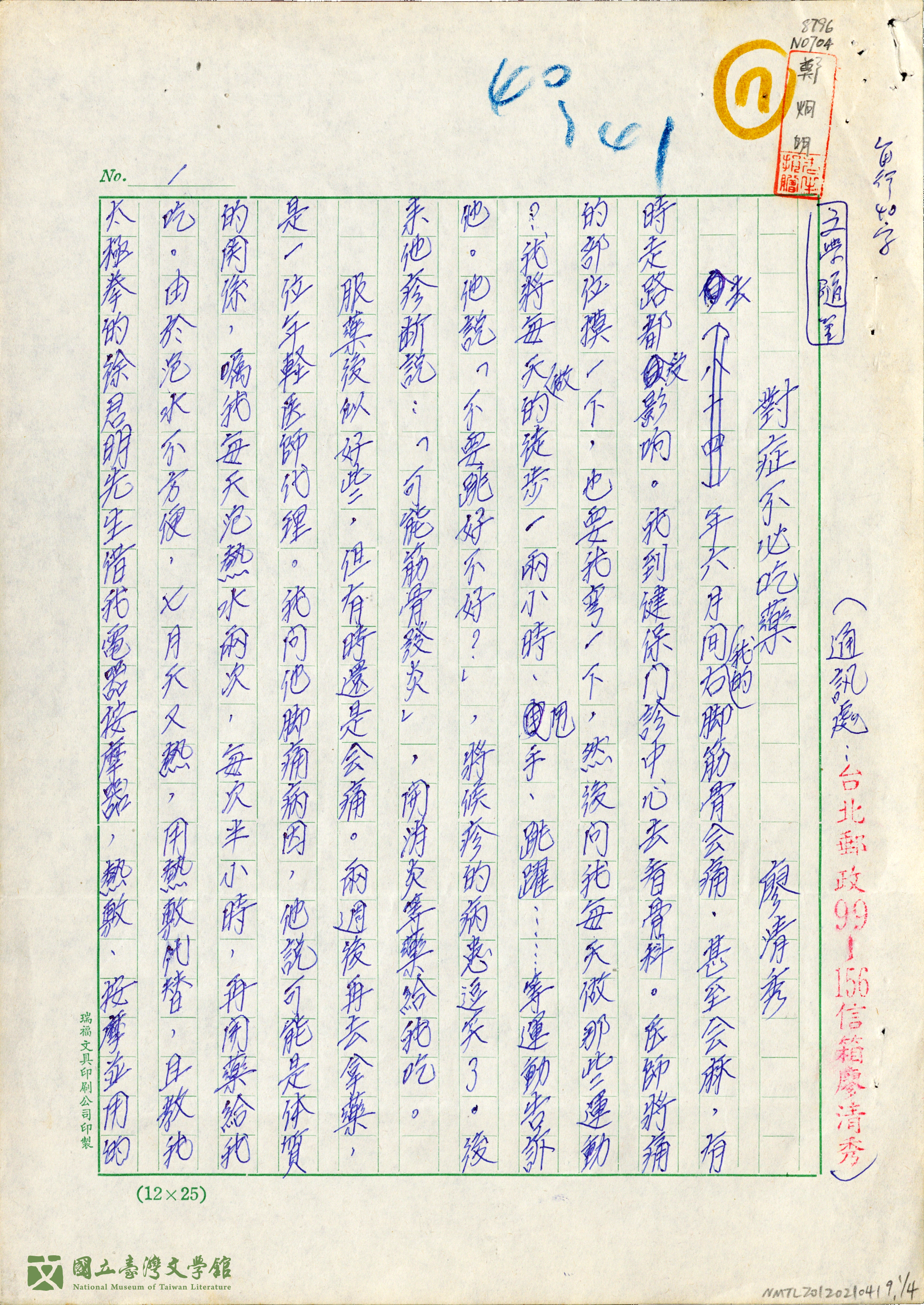 廖清秀(1927-2015)寫下自己患右足筋骨發炎的治療過程,在看骨科時常因不同醫生看待病症的觀念不同。而在對抗種種病痛時領悟到:治病需要對症,甚至能不必吃藥就得以痊癒。(文學台灣雜誌社捐贈/國立臺灣文學館典藏)