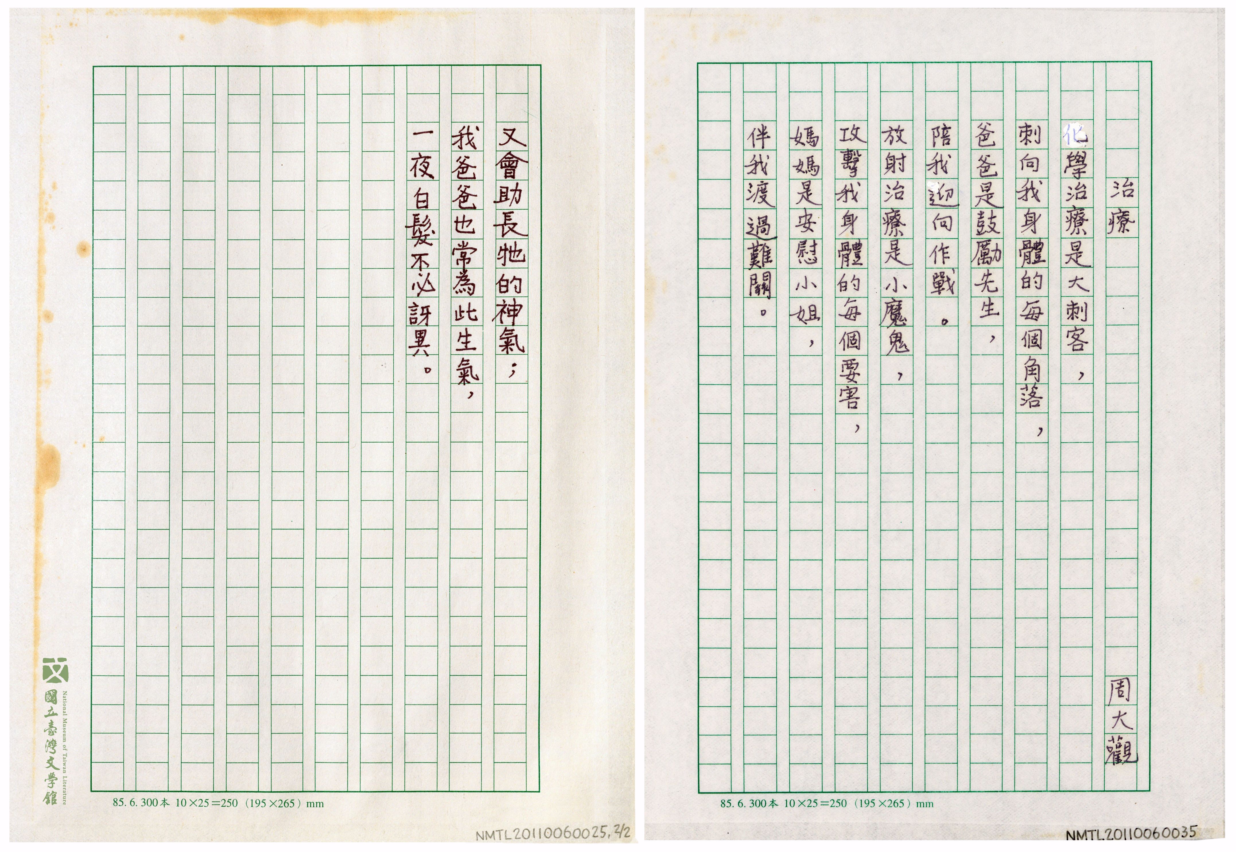 周大觀(1987-1997)年僅十歲便被診斷出患有惡性橫紋肌癌,歷經兩次開刀手術與多次化學治療。本文以「治療」為題,將化學治療與放射治療譬喻成刺客與魔鬼,而父母的陪伴之愛則與其共同對抗「治療」帶來的痛楚。(財團法人周大觀文教基金會捐贈/國立臺灣文學館典藏)