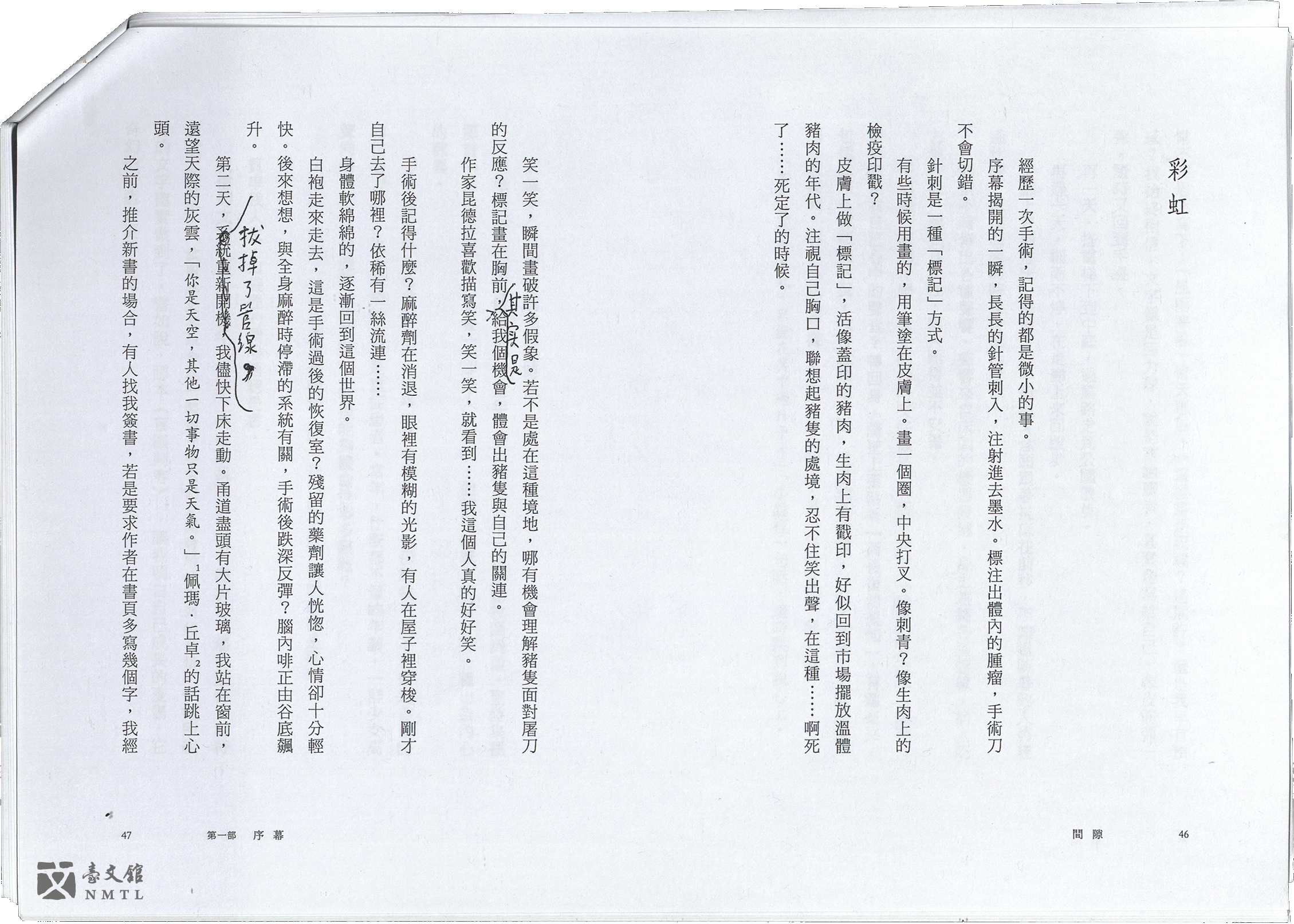平路(1953-)罹癌後,寫下對於自我生命的功課與觀省。此為《間隙》出版前的最終校對稿,可見作家對於字句的斟酌與思考。(平路捐贈/國立臺灣文學館典藏)