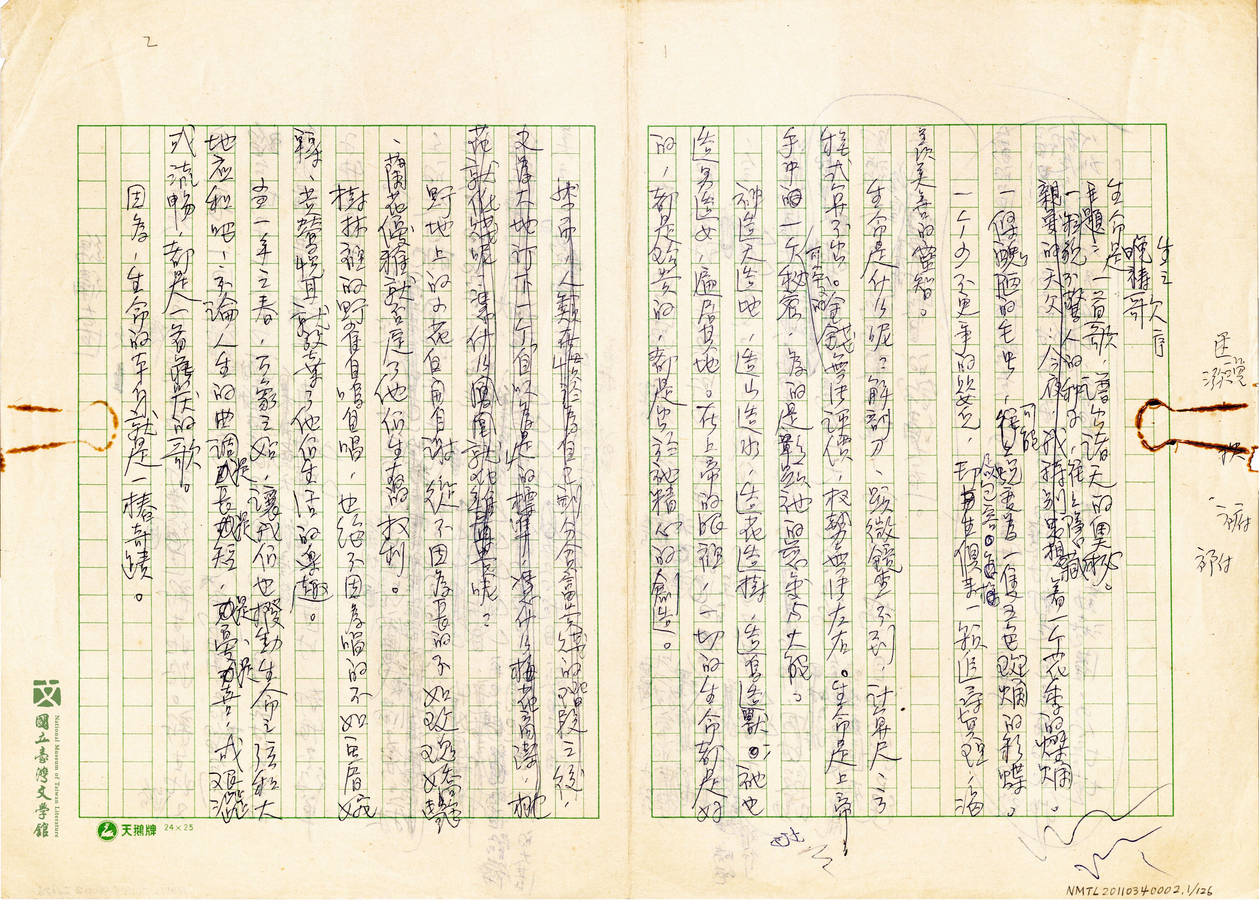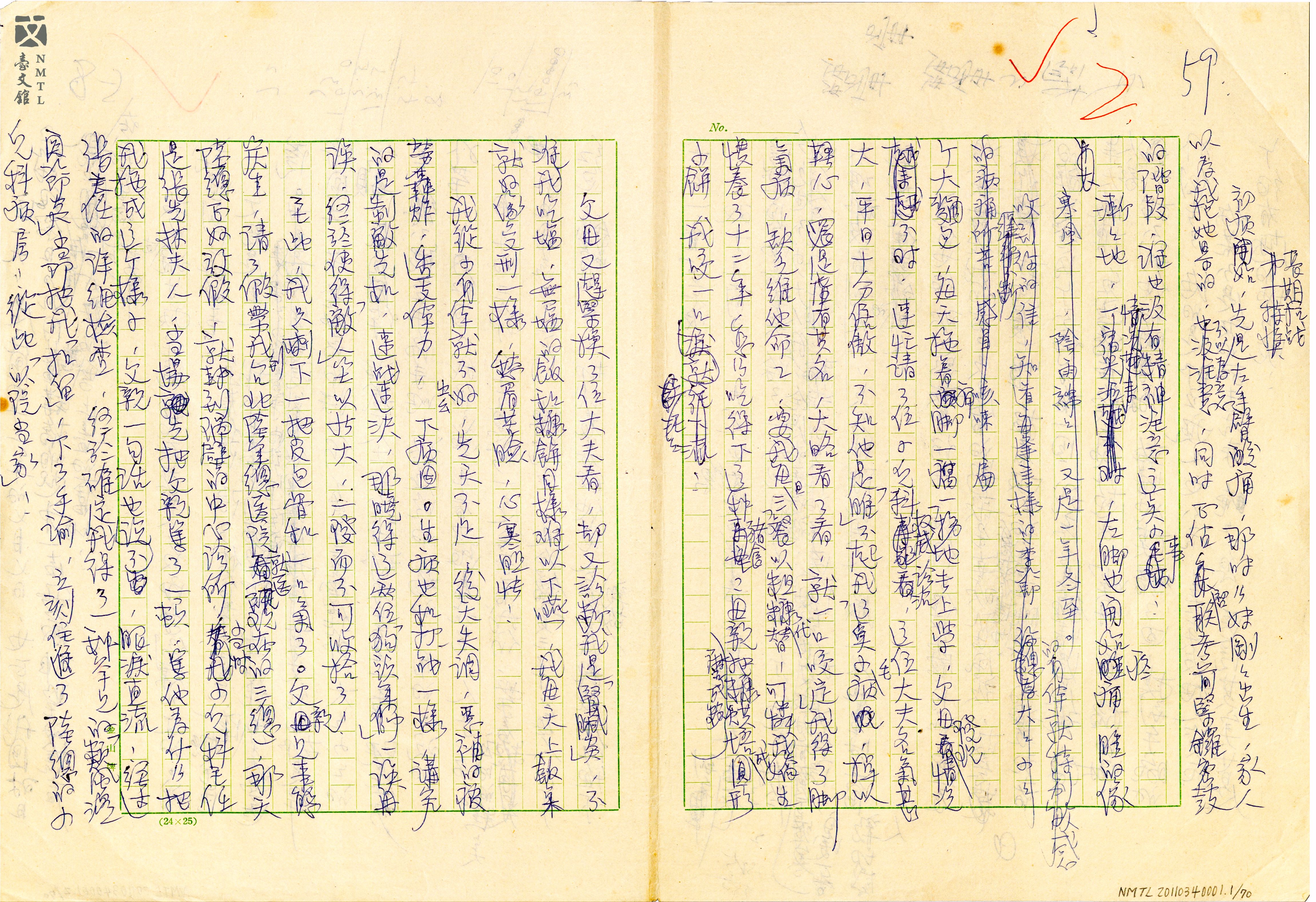 劉俠(1942-2003,筆名杏林子)記錄面對類風濕關節炎的病痛與醫療之過程,此手稿呈現出劉俠即便雙手不便,仍然持續寫作的意志,藉由生活中的小細節,引出自己與病魔奮鬥的感想,並寫下鼓勵生命的文字。(唐綿捐贈/國立臺灣文學館典藏)