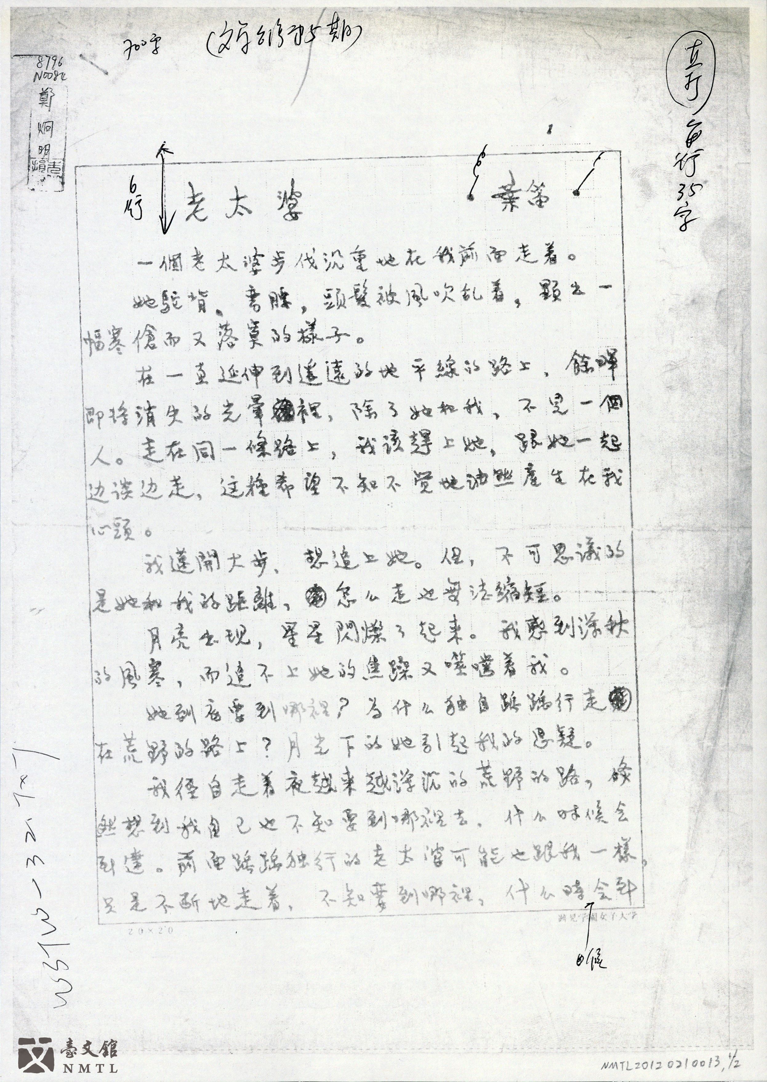 葉笛(1931-2006)夢見自己漫無目的地跟隨一位老太婆穿梭荒野,突然老太婆停下,轉身現出髑髏的樣子,因而被驚醒。爾後體認到老太婆即象徵生命的老去、死亡。(文學台灣雜誌社捐贈/國立臺灣文學館典藏)