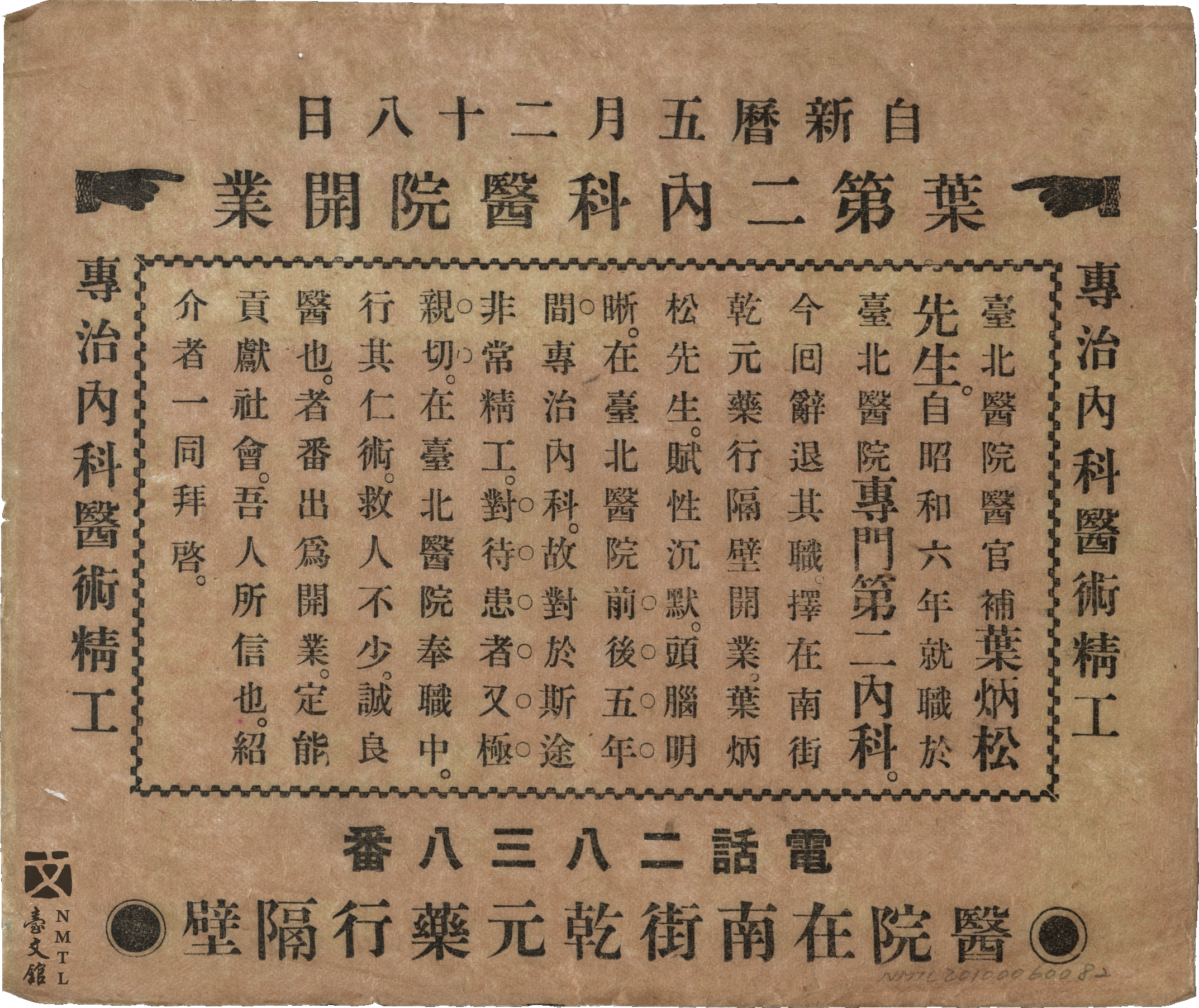 ◊ 葉第二內科醫院開業〈葉炳松〉宣傳單