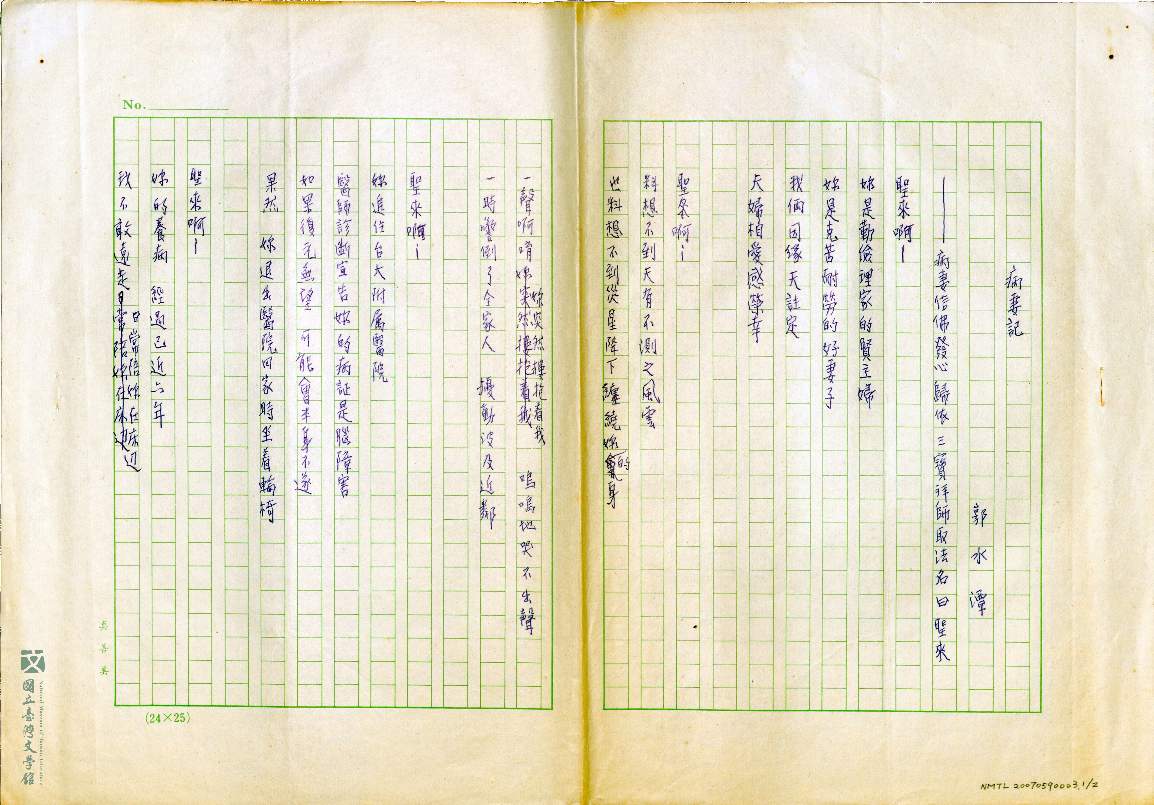 郭水潭(1908-1995)作詩思念久病臥床的妻子。本篇記錄妻子發病後的種種景象,並發願至各處求神拜佛只求妻子康復,在在顯示出對妻子愛憐之情。(郭昇平捐贈/國立臺灣文學館典藏)