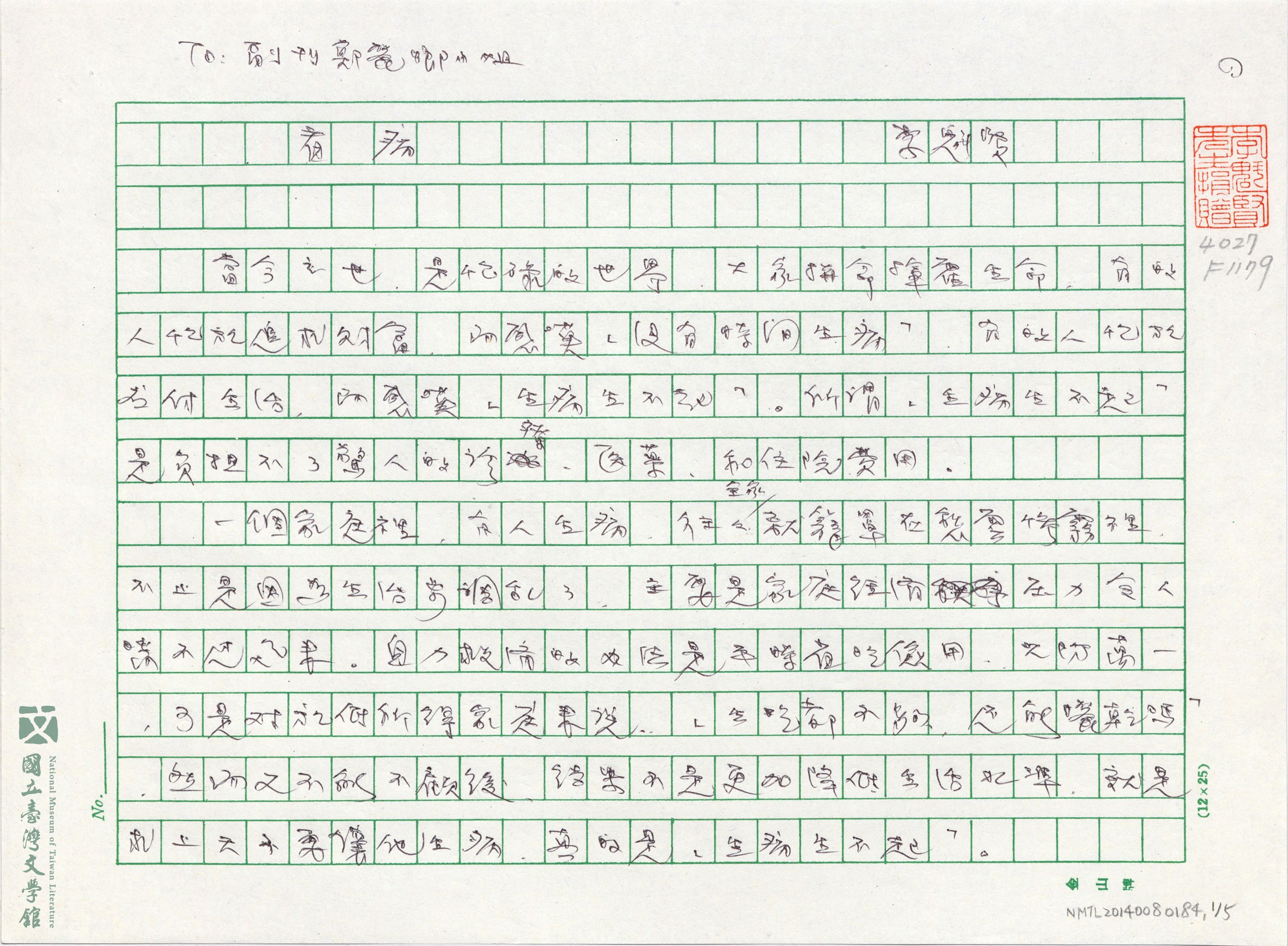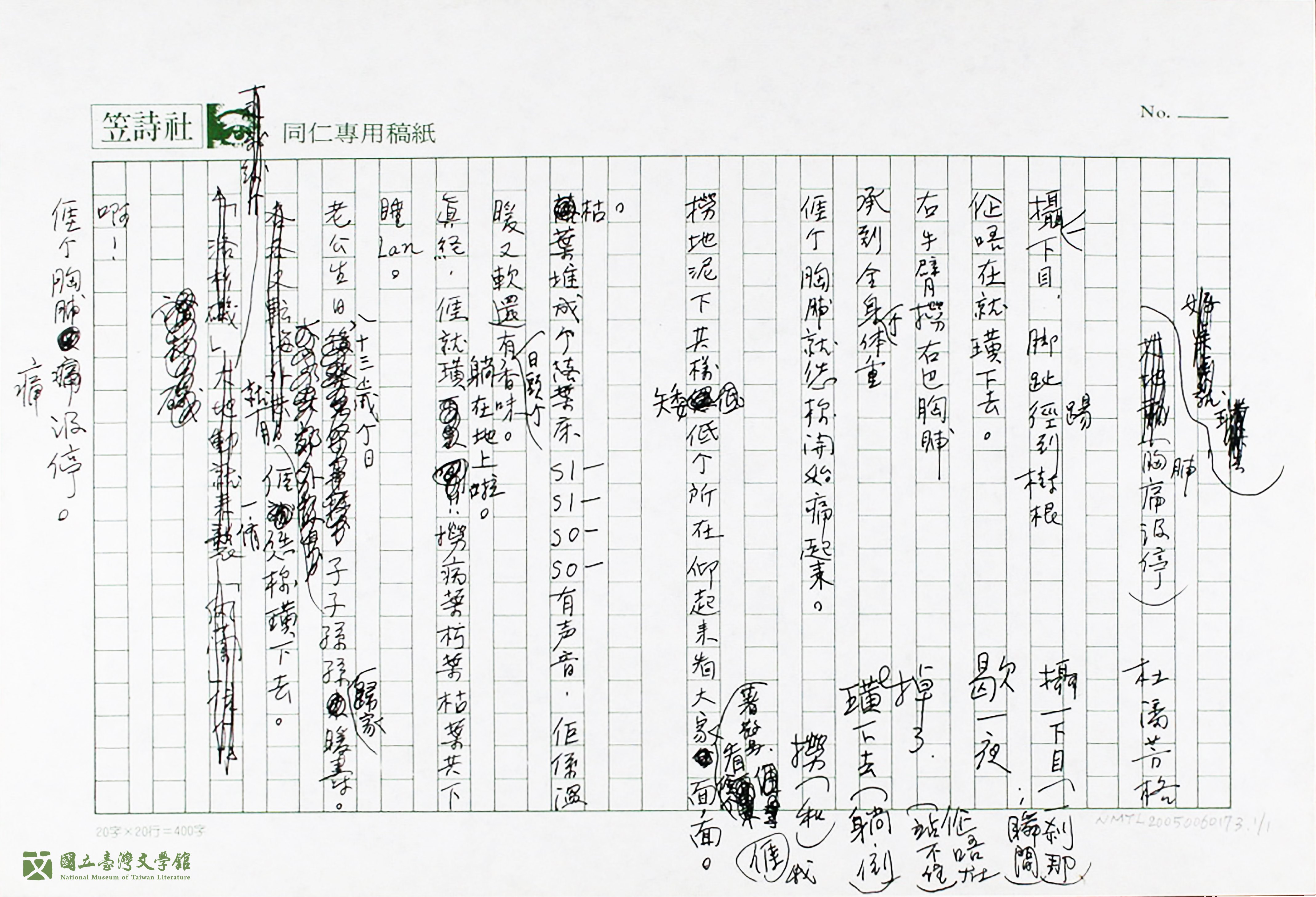 本篇發表於1989年,李魁賢(1937-)敘述了由於生病後可能負擔龐大的費用,許多老百姓「生不起病」,突顯臺灣社會福利政策之不足。作者認為臺灣的「全民保險」一字都沒一撇,因在臺灣住院仍需先繳保證金,再加上紅包文化的盛行,令病人聞之色變。(李魁賢捐贈/國立臺灣文學館典藏)