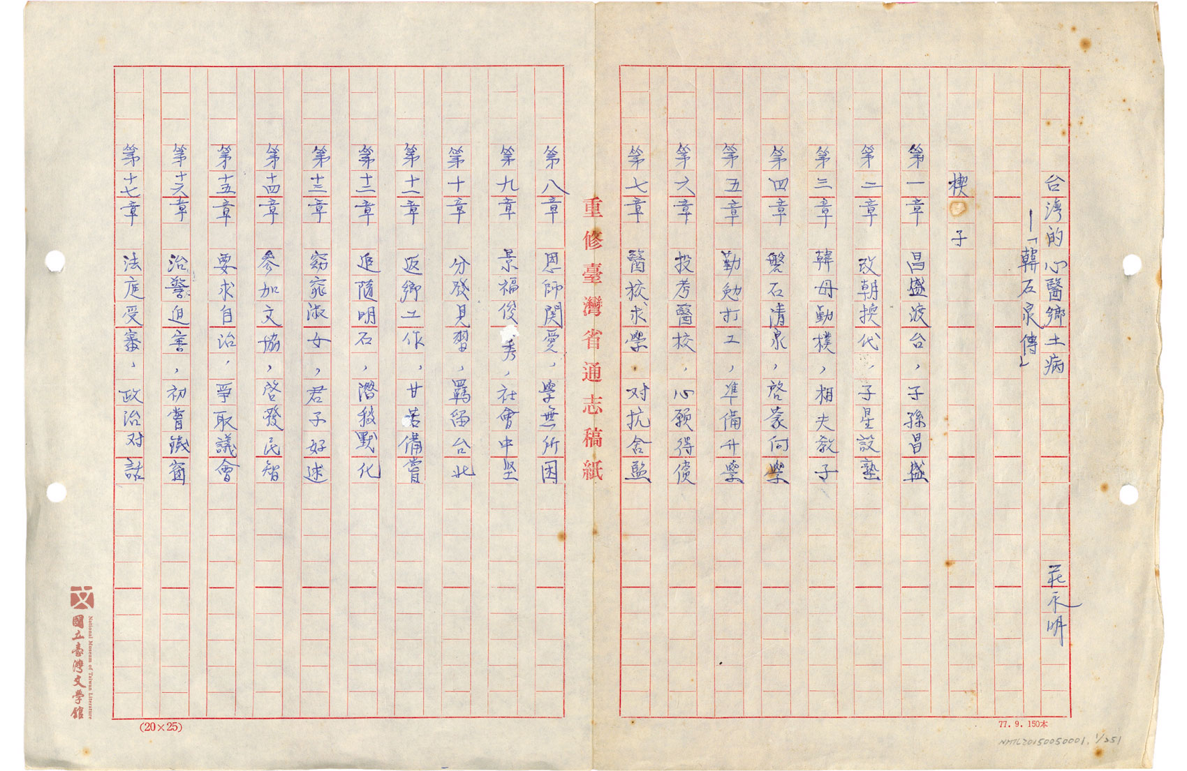 東方白(1938-)以丘雅信、江東蘭、周明德三個人物為核心,分別代表歷史上三個真實人物:臺灣第一位女醫生蔡阿信、前新竹中學校長張棟蘭及前成功中學教師陳銘德的故事。作者東方白把這三個家族的故事交織成大河小說,呈顯臺灣歷史與精神。(東方白捐贈/國立臺灣文學館典藏)