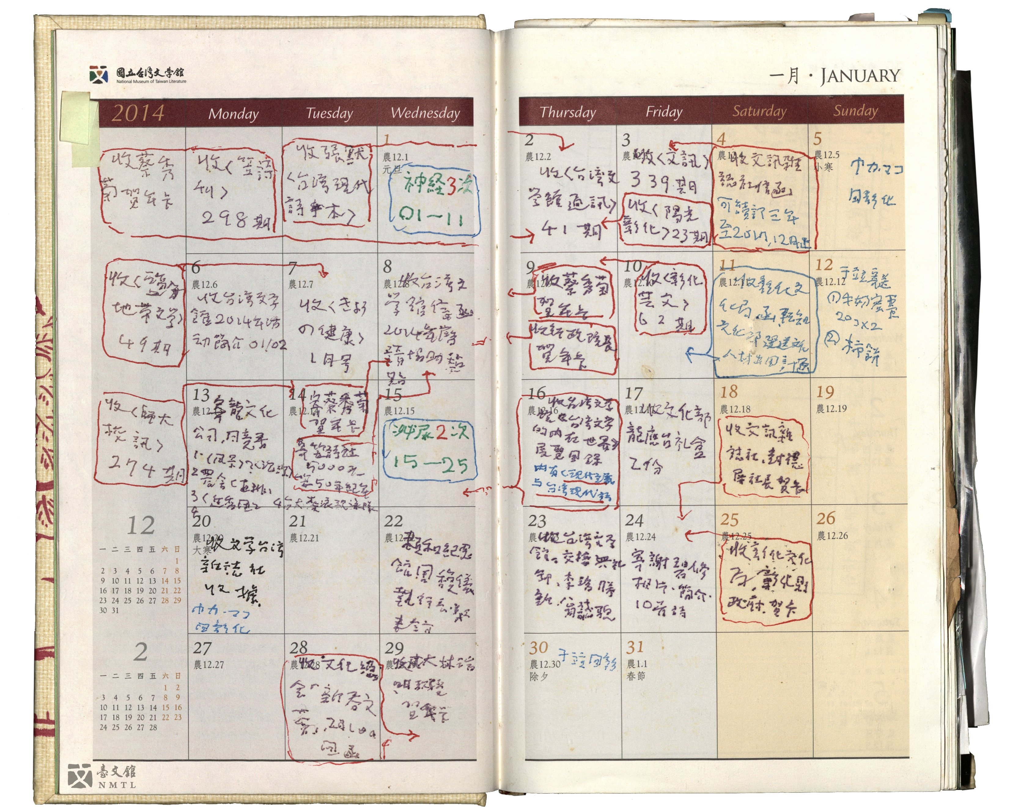 林亨泰(1924-2023)以文學館手札記錄2014年的生活瑣事,也記下每月往返醫院的看診記錄、藥單收據等。生活之餘,林亨泰也回憶自日治時期以來,自己罹患過的各種病症,得以看見其與疾病共存的痕跡。(林巾力授權)