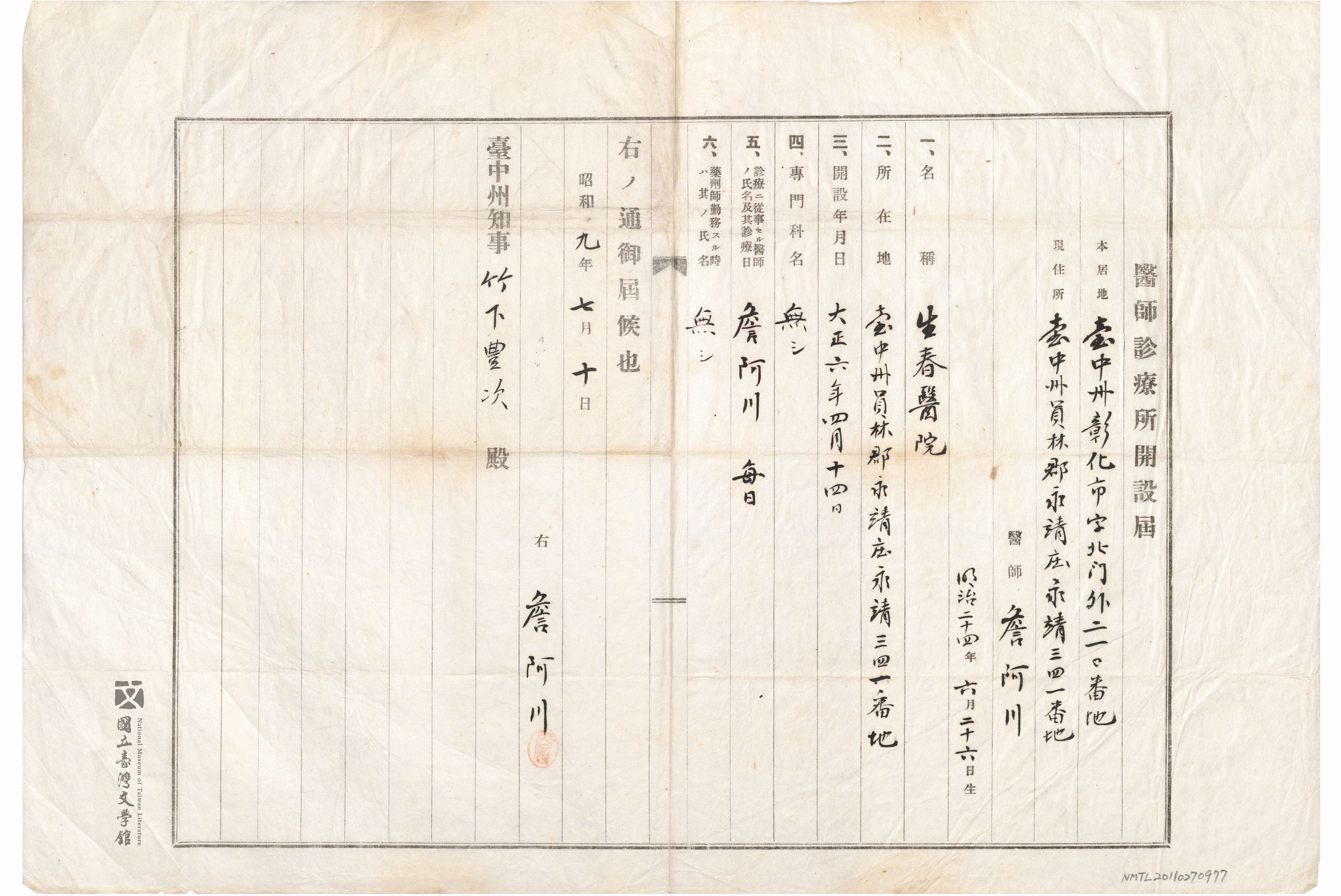 身為詩人及醫生身分的詹作舟(1897-1980),長年在故鄉永靖開設「生春醫院」,因深具醫德而備受尊敬。被稱為「永靖詩醫」。(詹元雄捐贈/國立臺灣文學館典藏)