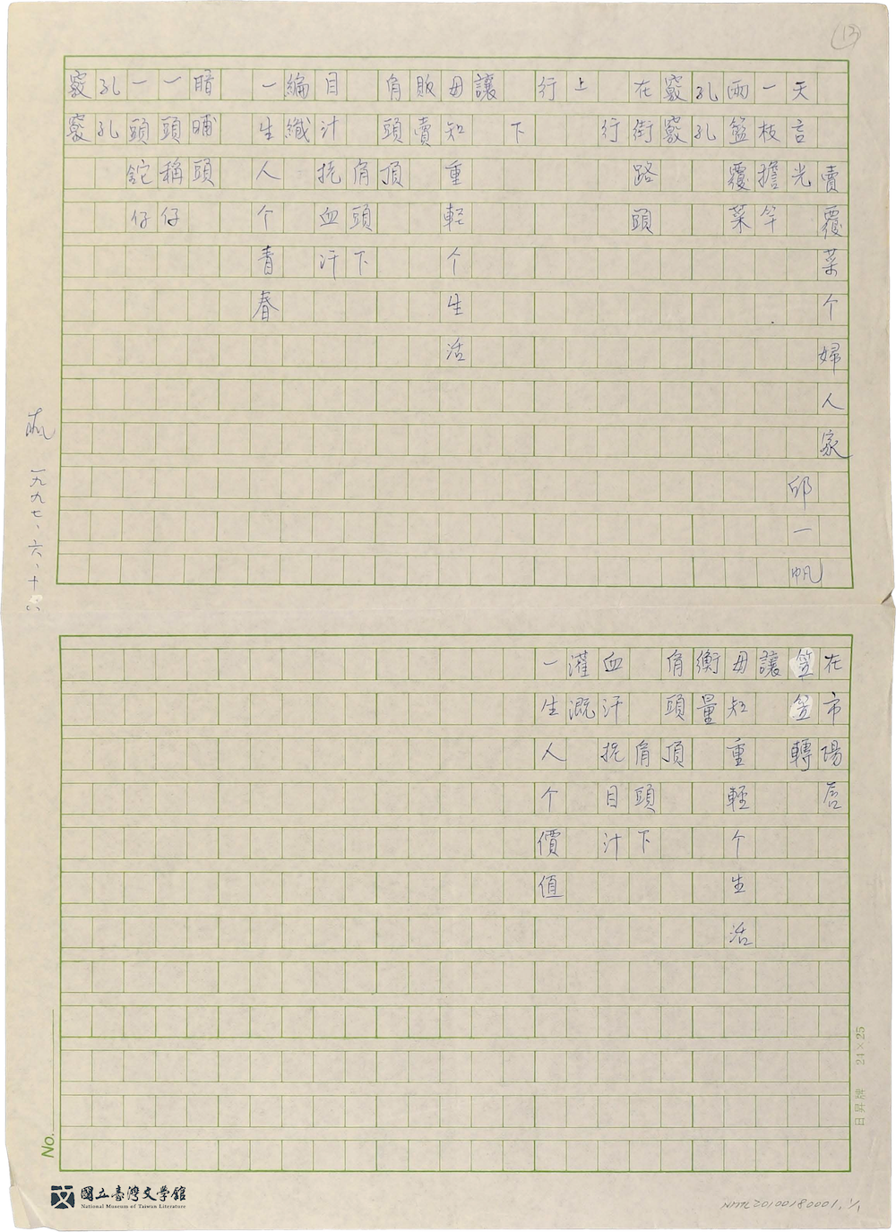 ▸ ▸ ▸ 邱一帆手稿,其詩作中常以醃漬物作為題材,例如〈阿姆个鹹菜〉、〈賣覆菜个婦人家〉。