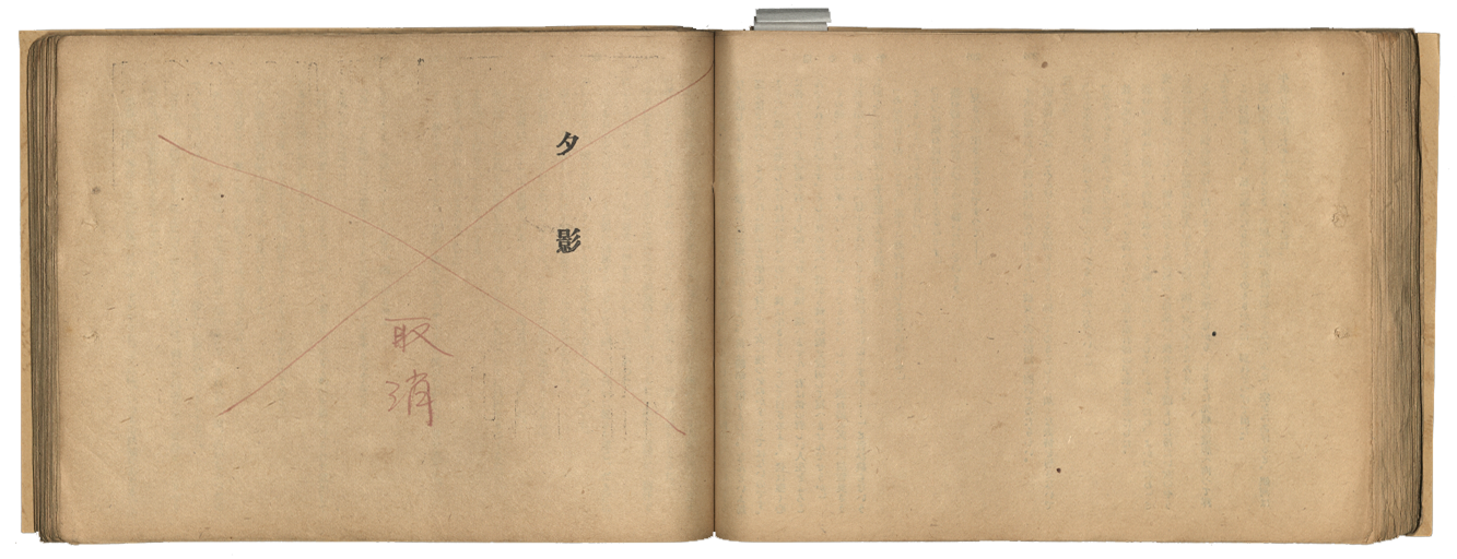 二戰期間,龍瑛宗打算出版小說集《蓮霧の庭》,收錄之小說皆已公開發表。但出版檢閱時,官方建議收錄「協力聖戰」的作品。龍瑛宗以〈年輕的海〉取代〈夕影〉,依然無法通過審查。(國立臺灣文學館典藏)