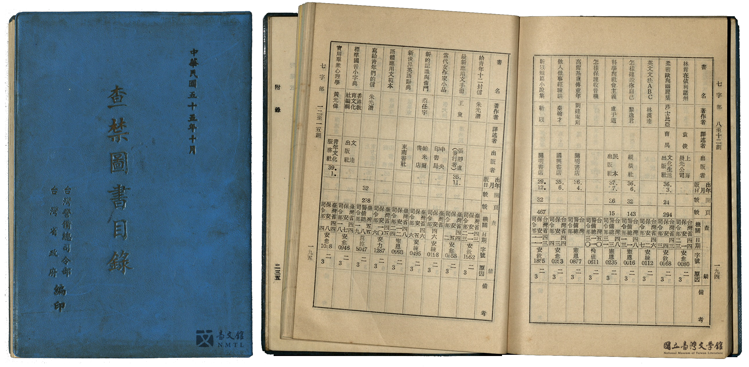 由臺灣省政府及警備總司令部發行的禁書目錄,明列查禁法令依據,依書名之字數索引造冊,詳列書刊基本資料與查禁依據字號。《查禁圖書目錄》幾年就會更新一版,此為1966年10月版。(國立臺灣文學館典藏)
