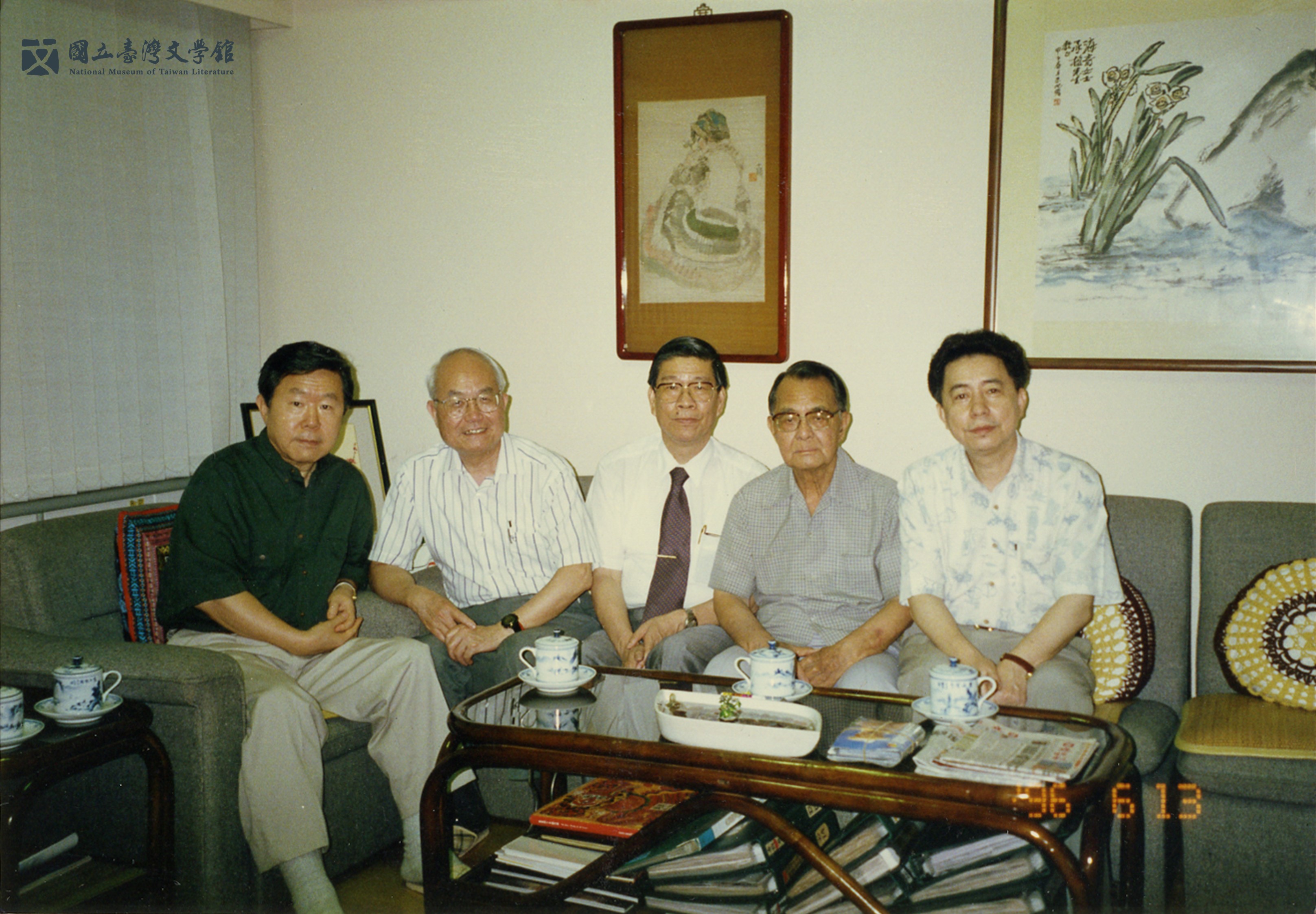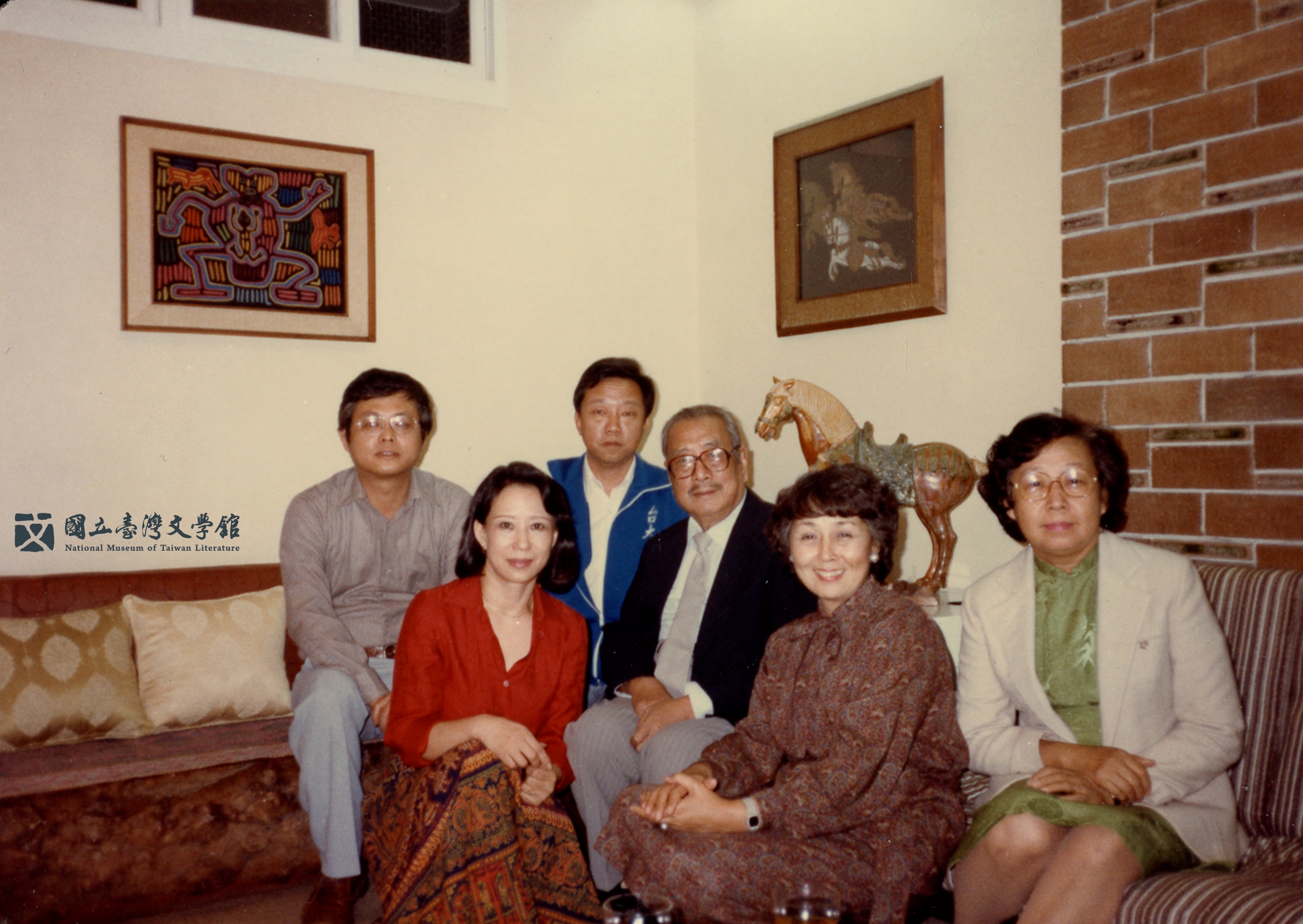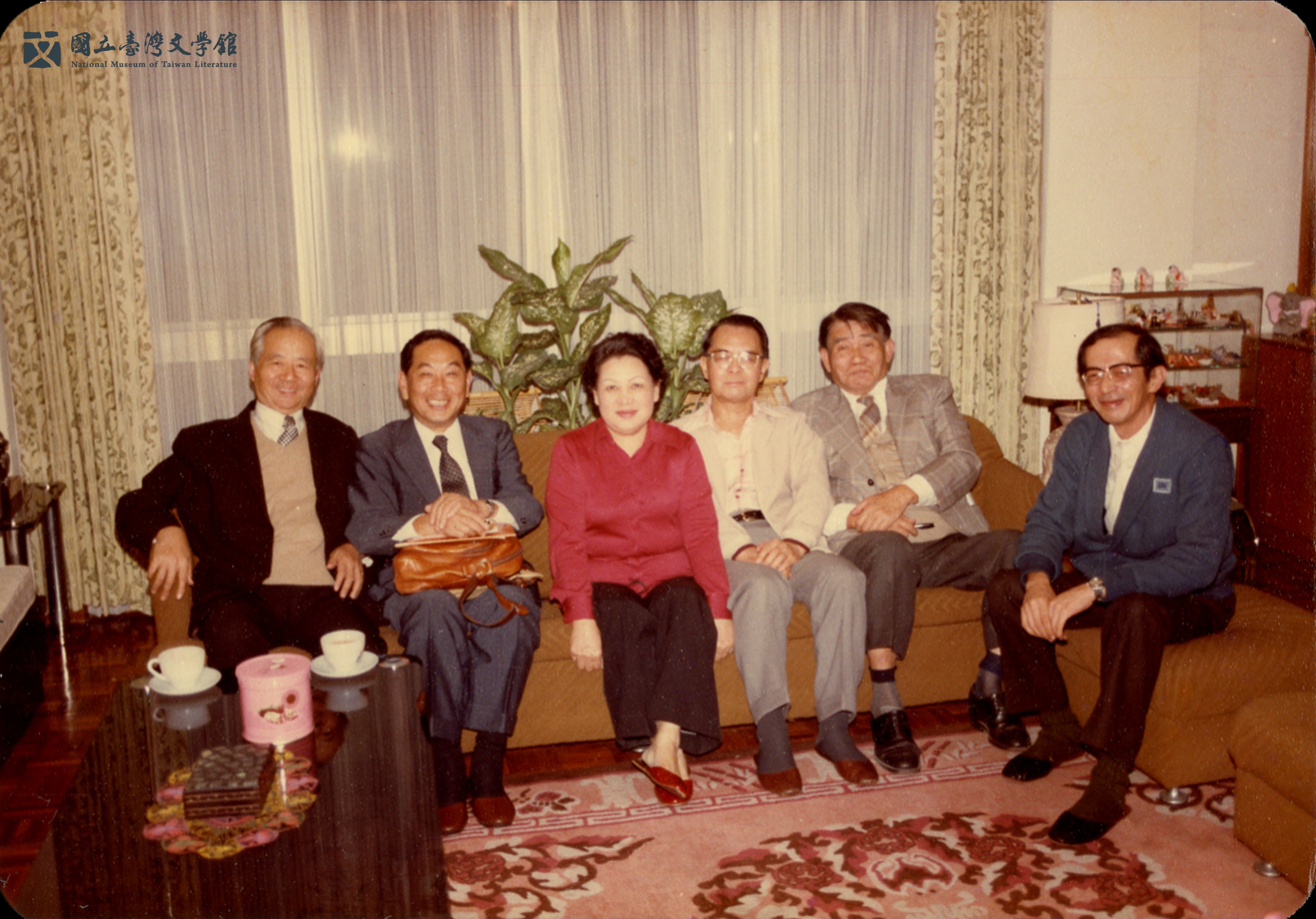 林海音的客廳,人稱半個文壇。左前一林文月,左後一楊牧,右前一齊邦媛,右二殷張蘭熙,中座者為臺靜農。(國立臺灣文學館典藏)