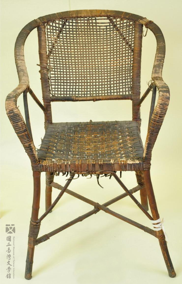 葉石濤習慣坐在此藤椅寫作,自1960年代於書房使用,超過30年,極具紀念價值。陳芳明描寫1989年拜訪葉老時的情景:「原來他文字所說的天譴,並不只是精神層面而已。一把陳舊的藤椅緊貼斑驳的書桌,玻璃窗外是喧嚷的市聲……從前在書裡看到他坐在桌前寫稿的照片,由於是黑白印刷,我以為那是優雅的空間。」 這座承載著文學力量的藤椅徵集入館之後,經過細密的修復作業與3D掃描,並成為《夢獸之島》VR射擊遊戲中的破關道具,完整經歷了文物進入博物館後的奇幻旅程。(國立臺灣文學館典藏)