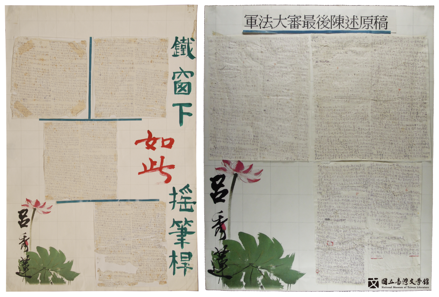 ⭔ 呂秀蓮《這三個女人》部份草稿(左)、〈軍法大審最後陳述原稿〉(右)