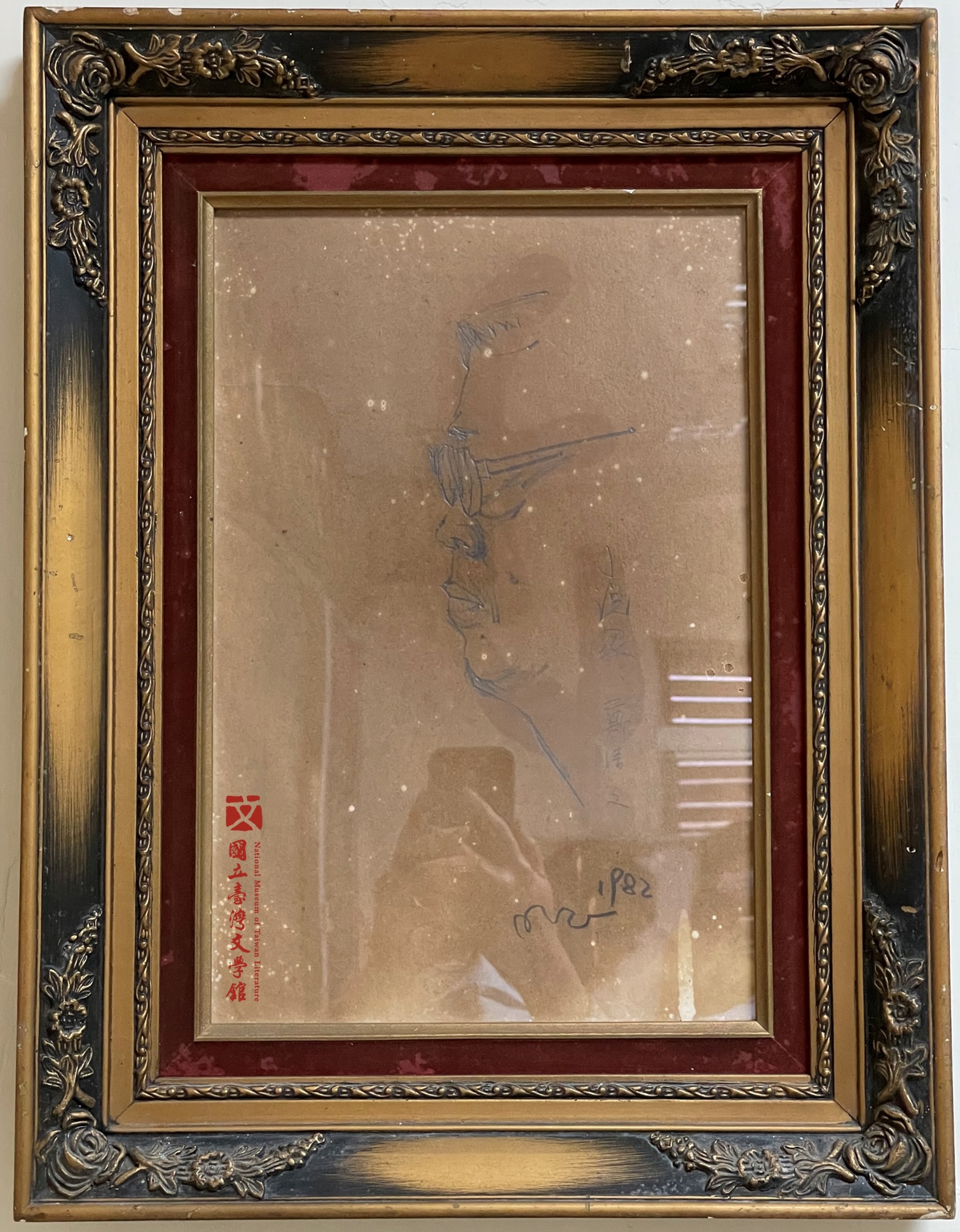 2021年初,臺文館前往紀念館檢視,這批畫作展示於會議室中。其中繪製「小說家鄭清文」的畫作,因吊掛的牆面緊鄰西曬窗,加上畫作直接接觸畫框的木製夾板,黃化變色最為嚴重,黃褐色底紙上的鉛筆線稿幾乎難以辨識人物輪廓。(國立臺灣文學館典藏)