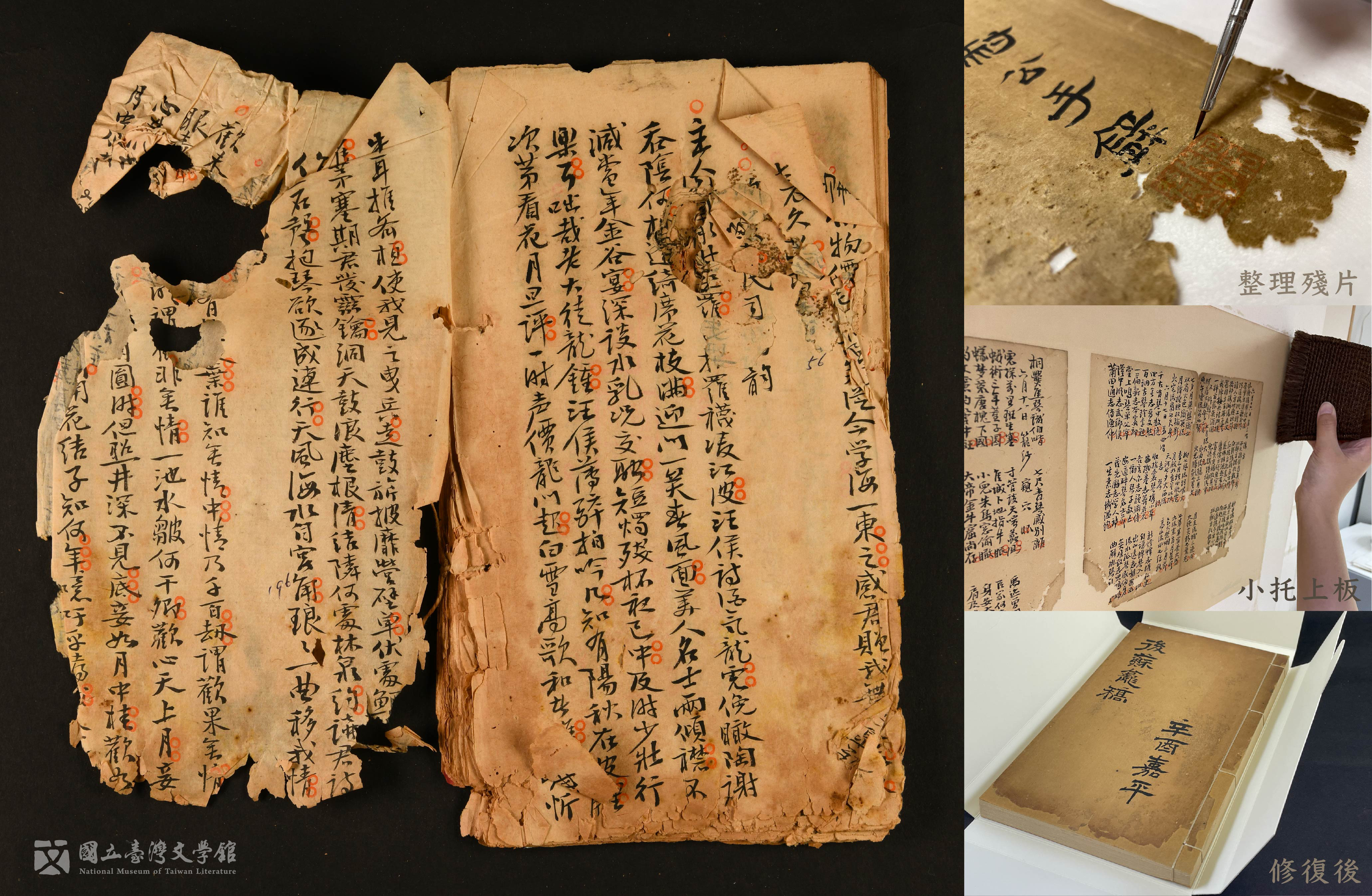 紫霞堂部分文物受蟲蛀導致書頁沾黏也相當嚴重,花了很多時間才將書頁一一分開,整理拼湊。透過重新裝幀、攤平、小托等工序,逐一穩定文物的現況。(國立臺灣文學館典藏)