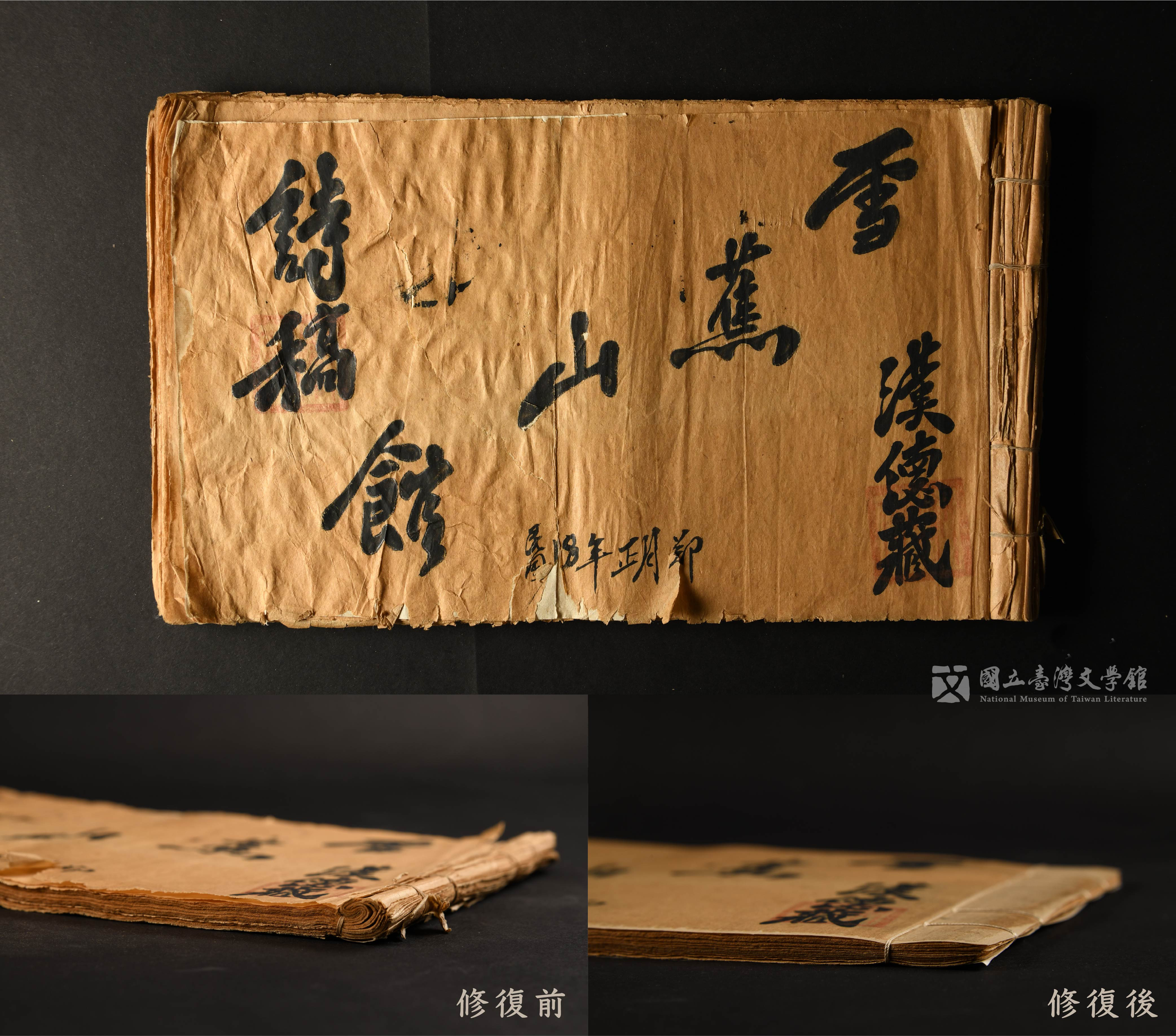 此批線裝書受嚴重的蟲蛀,書頁多沾黏無法分離,造成手稿字跡無法辨識,亦無從翻閱。部分書稿有受潮且黴害侵擾的問題,入館後隨即單本隔離,並分年度陸續完成修護處理。(國立臺灣文學館典藏)