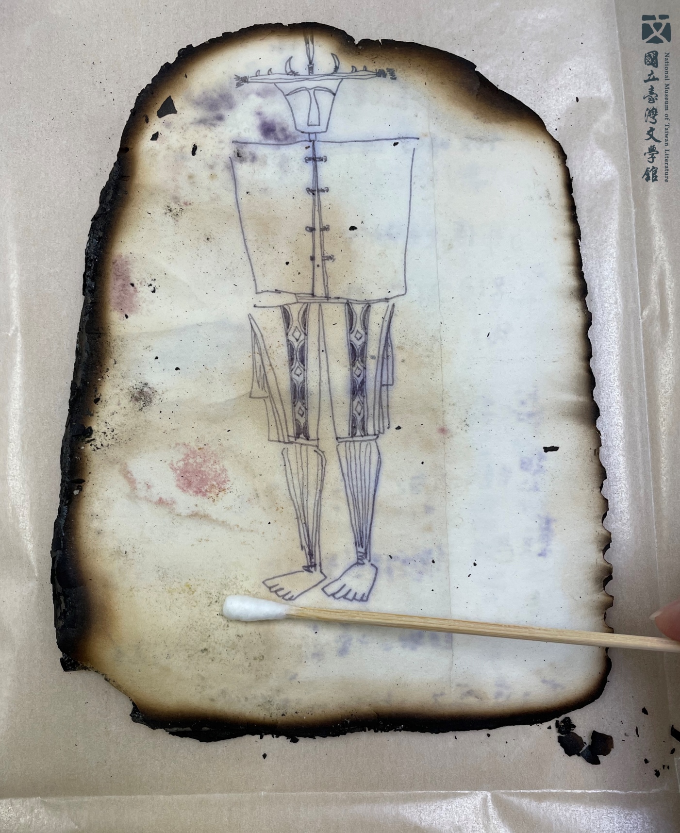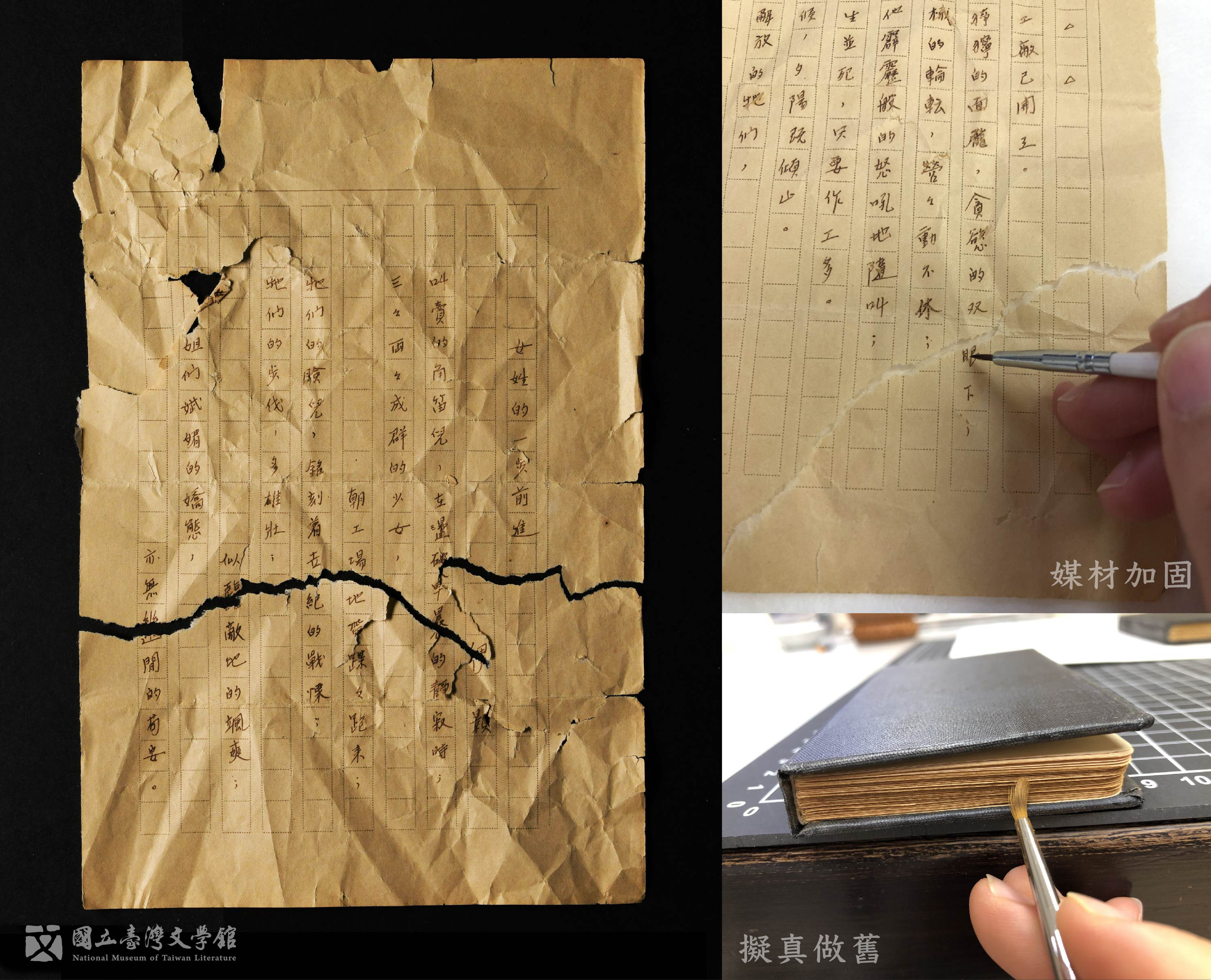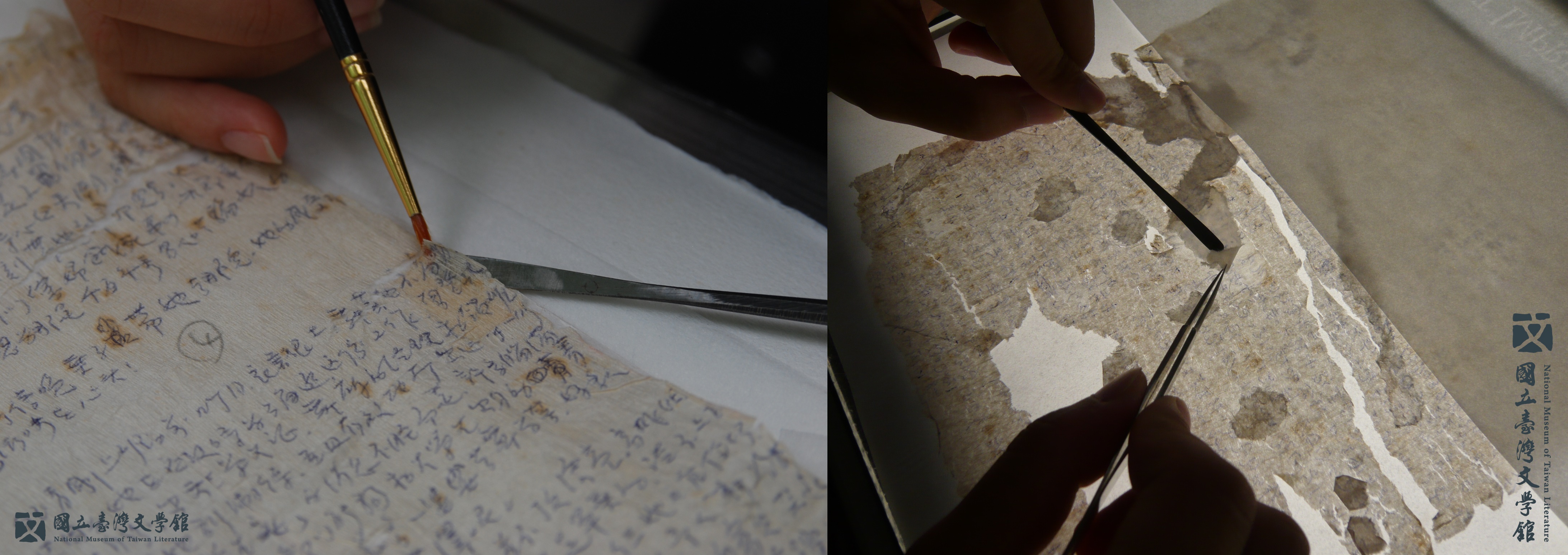 單薄的紙張,亙古以來承載了無可計數的知識寶藏,特別是衛生紙漿料成分複雜且質地軟又薄皺,經年累月下又因為黏膠造成的局部膠漬、破損及脆裂等多重傷害,實為保存的一大挑戰。修護時首重移除不穩定的因子,加強衛生紙結構,並透過妥善的典藏保存,讓珍貴手稿得以再次展示於大眾。