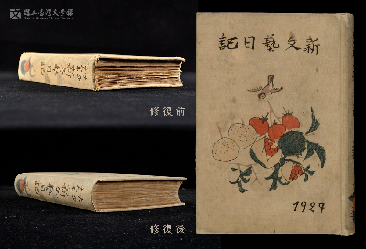 《新文藝日記1927》修護後將書背襯布與書皮黏合,扉頁與書皮紙板黏合,還原完整的書籍結構。(國立臺灣文學館典藏)