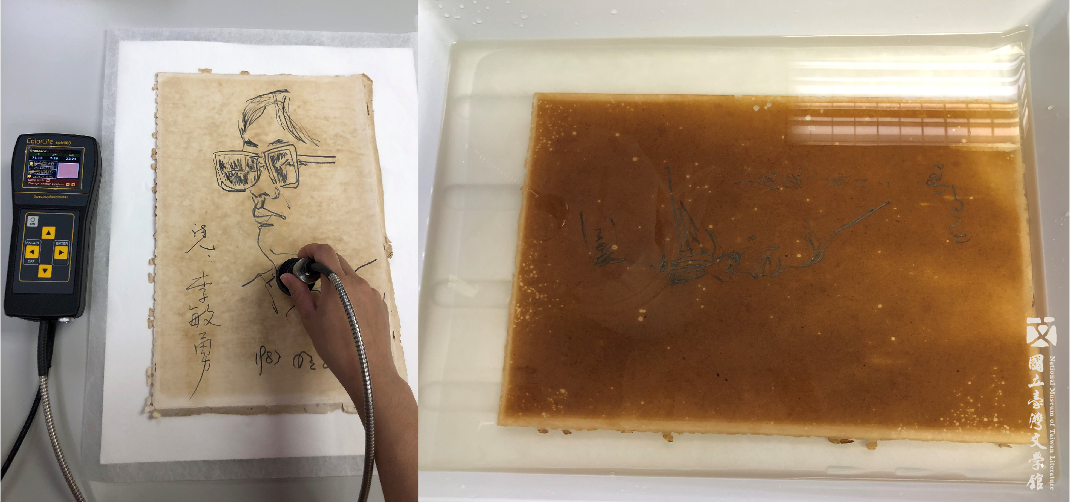 以色差檢測儀紀錄清洗過程中紙張顏色的變化。(國立臺灣文學館典藏)