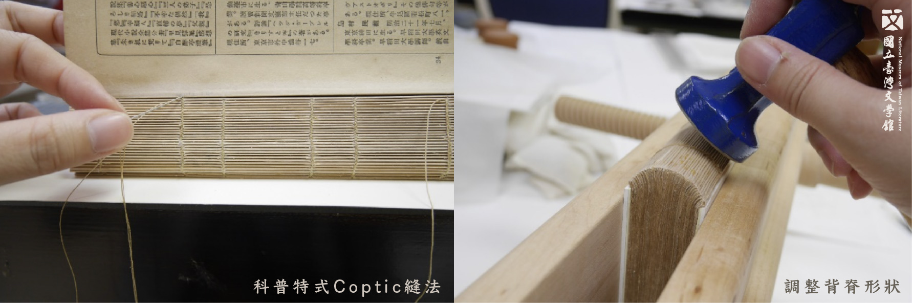 原書頁為機器量產之縫法固定,修護後採手工裝幀——科普特式Coptic縫法將書頁縫回,並以圓背錘調整背脊形狀,以符合原有裝訂形式。(國立臺灣文學館典藏)