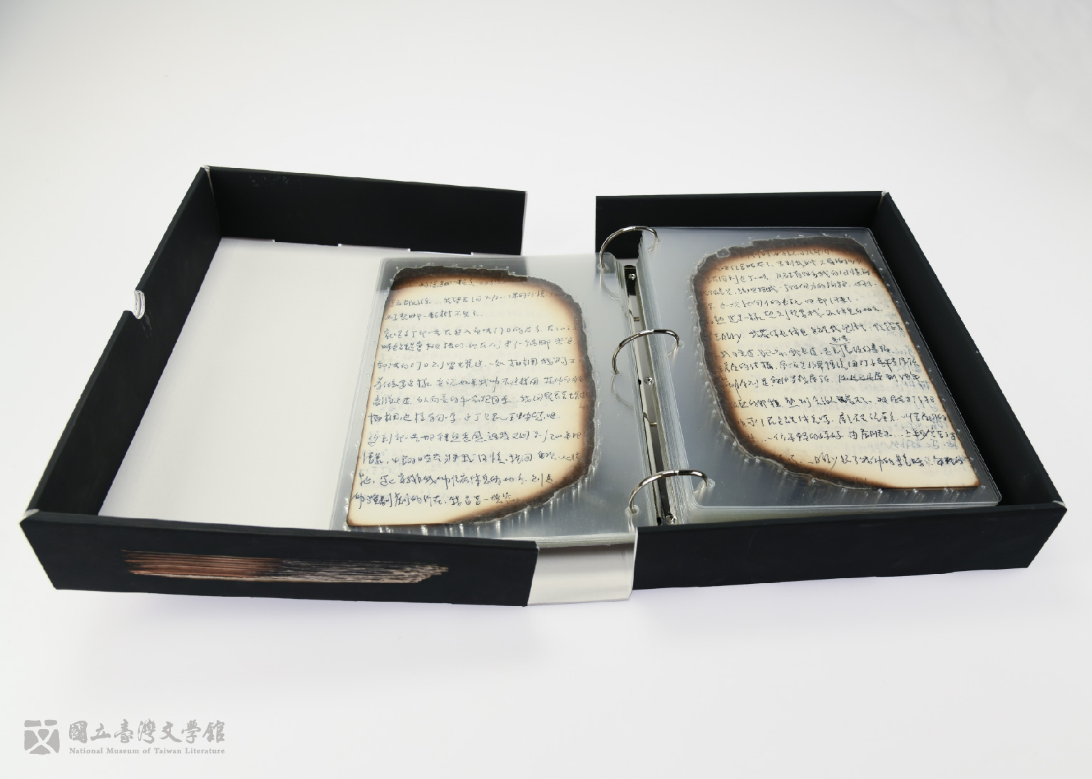 紙張歷經了大火、消防灌救與風乾,留下嚴重焦脆、黴害、媒材暈染、透色、漬痕、變形、黑炭覆蓋及不良物質殘留等複雜劣化問題,一定程度影響手稿紙力結構與外觀,相當不利保存。所幸殘存手稿仍留有約2/3的紙張,交由國立臺灣文學館接下修護的任務,期許蒙塵的手稿得以再現靈光。撒可努手稿修護後手稿存放於量身訂製的保護盒。(撒可努(Sakinu Yalonglong)提供)
