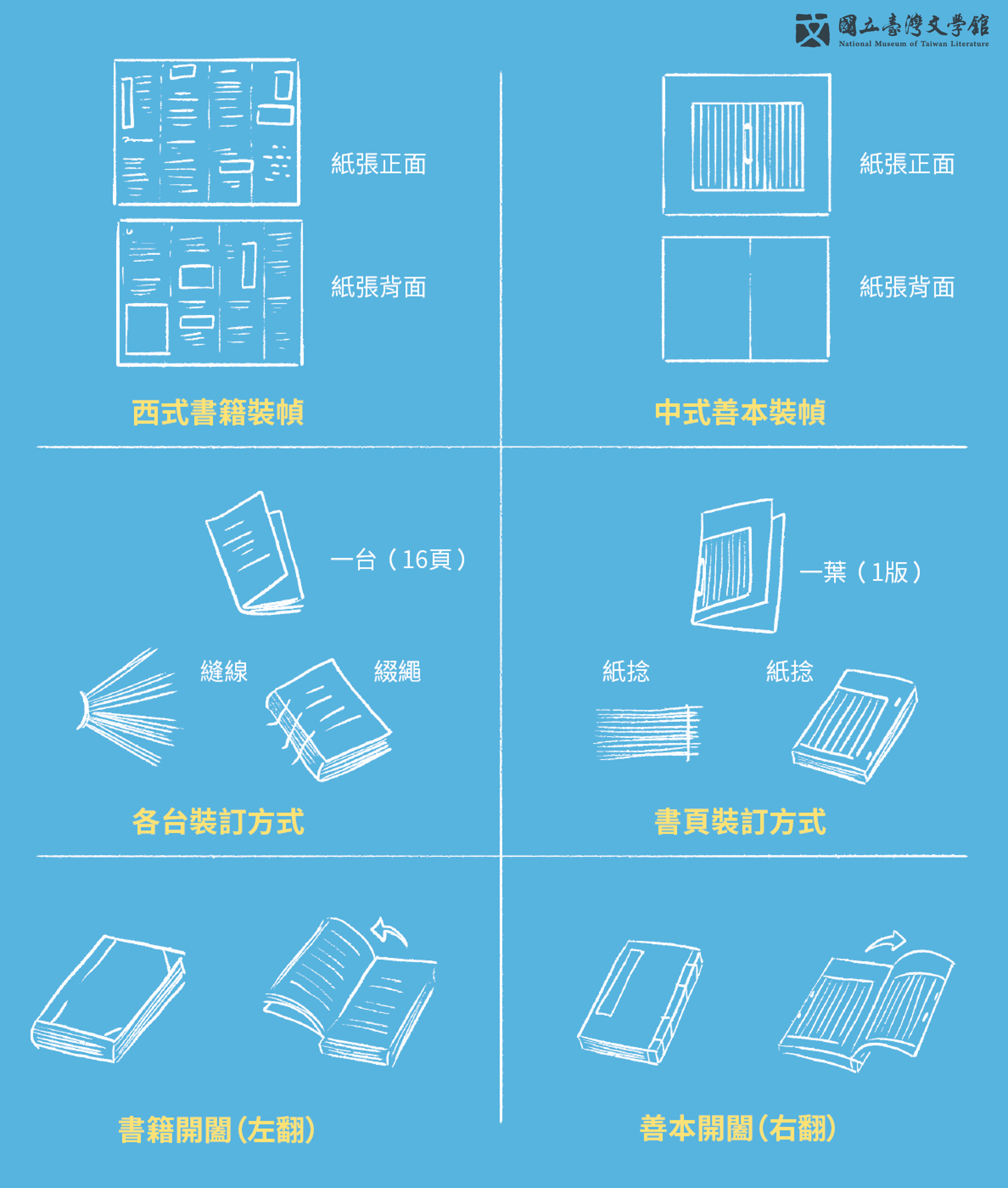 翻開裝幀的歷史,東方書籍結構的遞嬗,早從先秦的編策(簡牘)、片繒(帛書)、軸裝(手卷)、摺本(冊葉、經摺裝)到印刷裝幀成冊(蝴蝶裝、包背裝、線裝);與此相近的歷程,也顯現於西方世界的古籍演變,如西亞兩河流域的泥版、古埃及的紙莎草紙卷、古歐洲的羊皮紙卷,再到印刷後摺疊裝訂的紙本書冊型式。廣義來看,不論是東西方文化,書籍皆不約而同由平面演變到立體形貌,更在發展漸趨成熟時,邁入印刷裝訂型式。