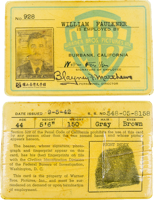 福克納1942年在好萊塢期間擔任編劇的工作證。