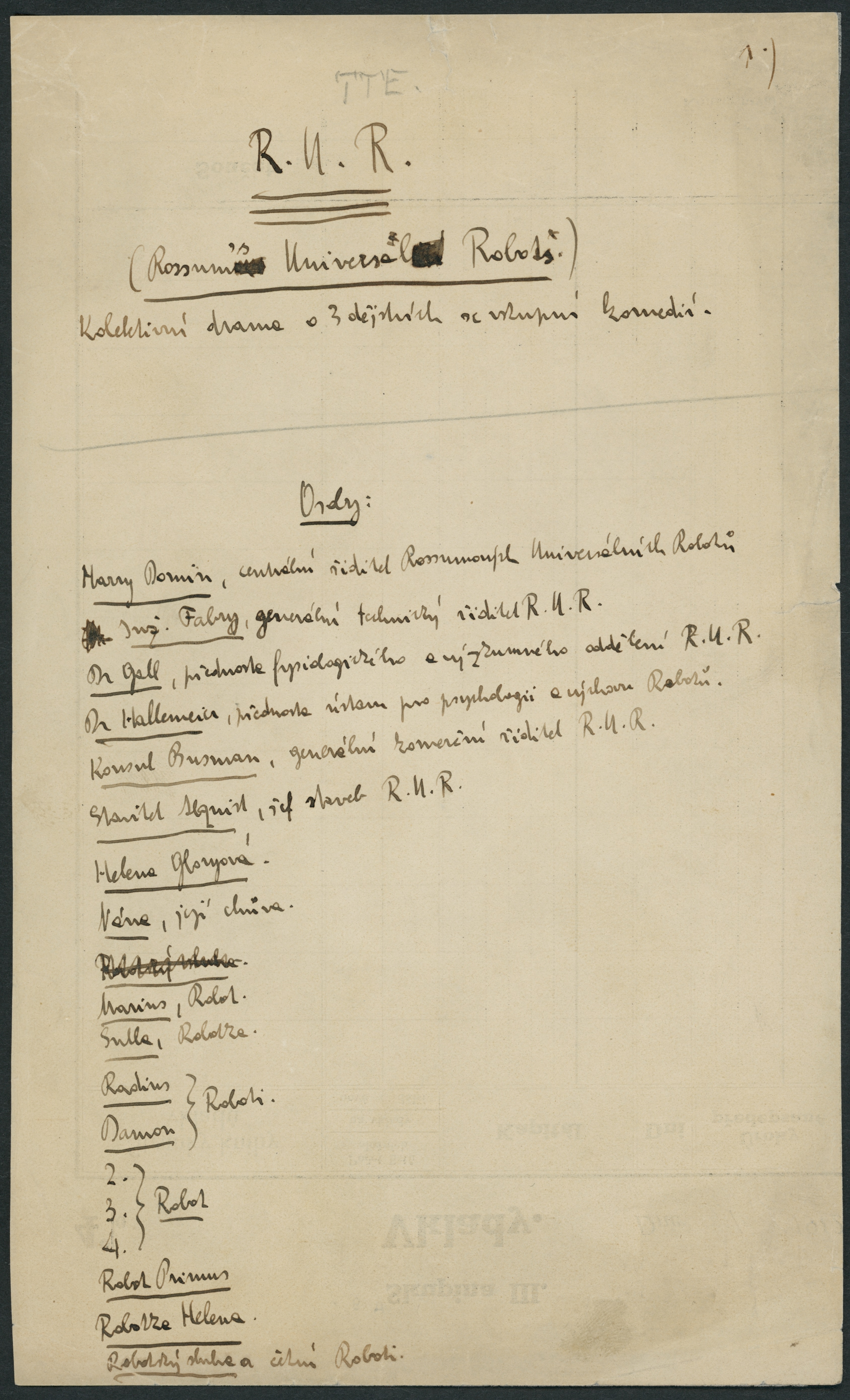 《R.U.R.》手稿,複製品。