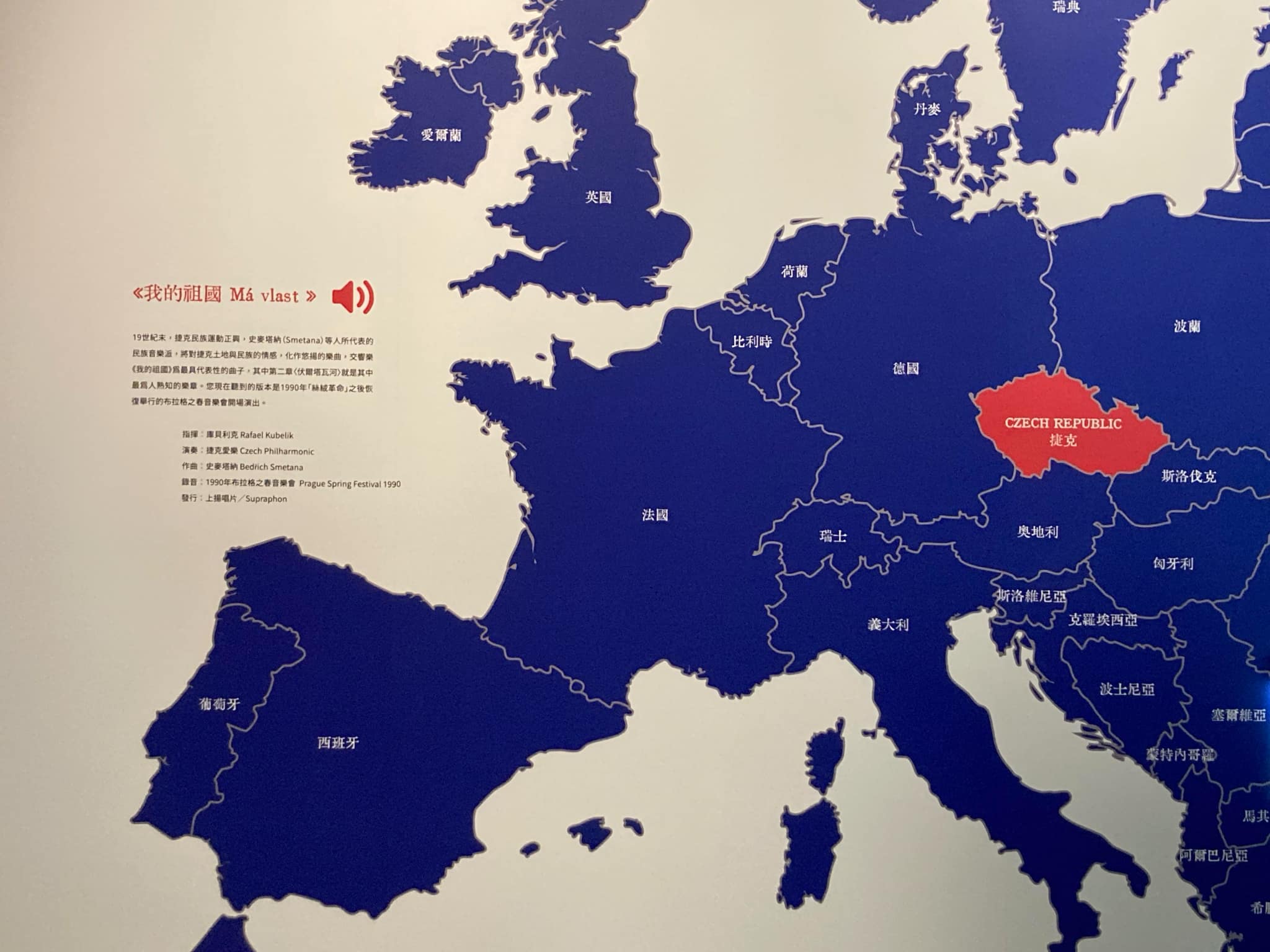 19世紀末,捷克民族運動正興,史麥塔納(Smetana)等人所代表的民族音樂派,將對捷克土地與民族的情感,化作悠揚的樂曲,交響樂《我的祖國》為最具代表性的曲子,其中第二章〈伏爾塔瓦河〉就是其中最為人熟知的樂章。您現在聽到的版本是1990年「絲絨革命」之後恢復舉行的布拉格之春音樂會開場演出。