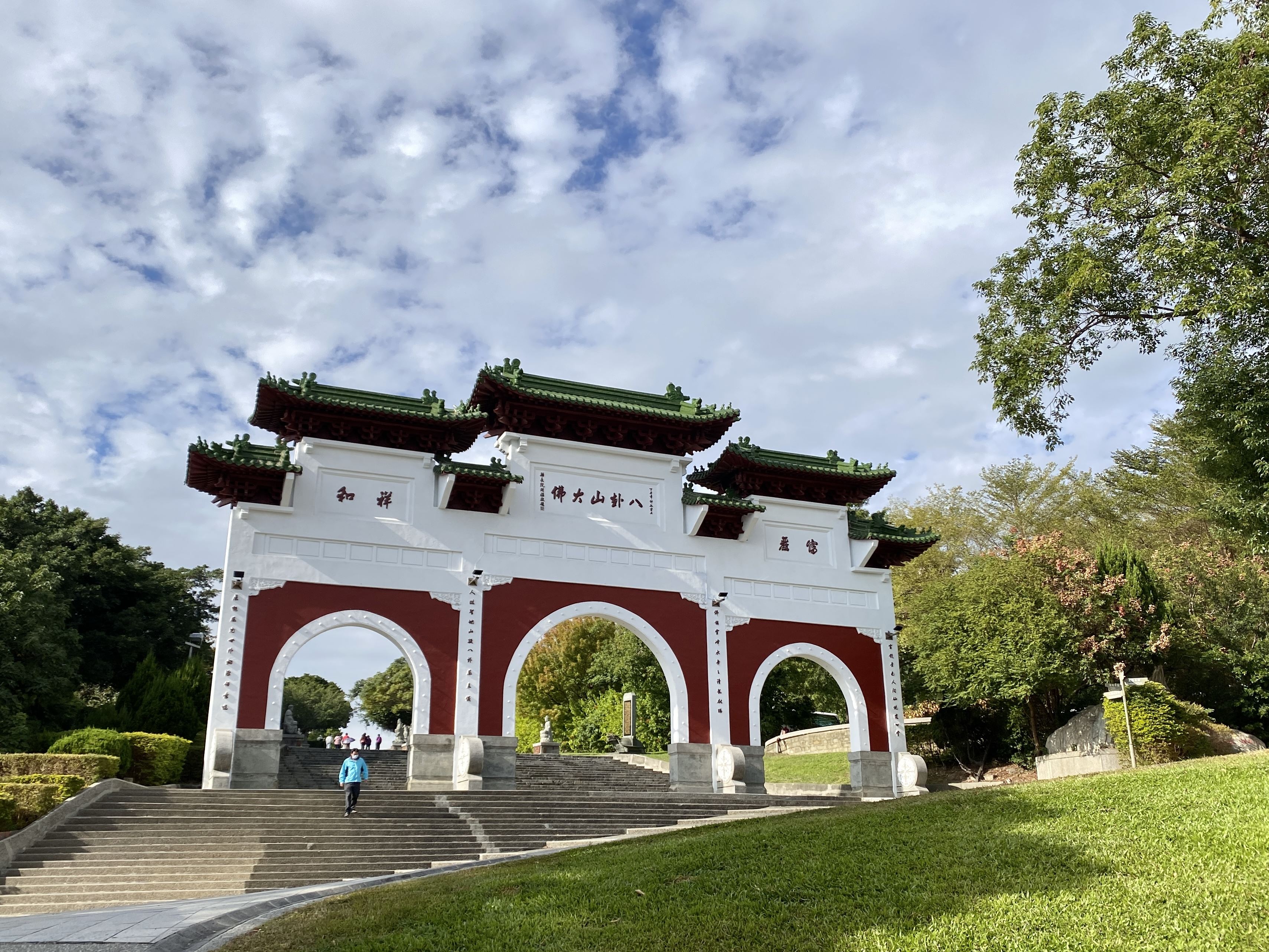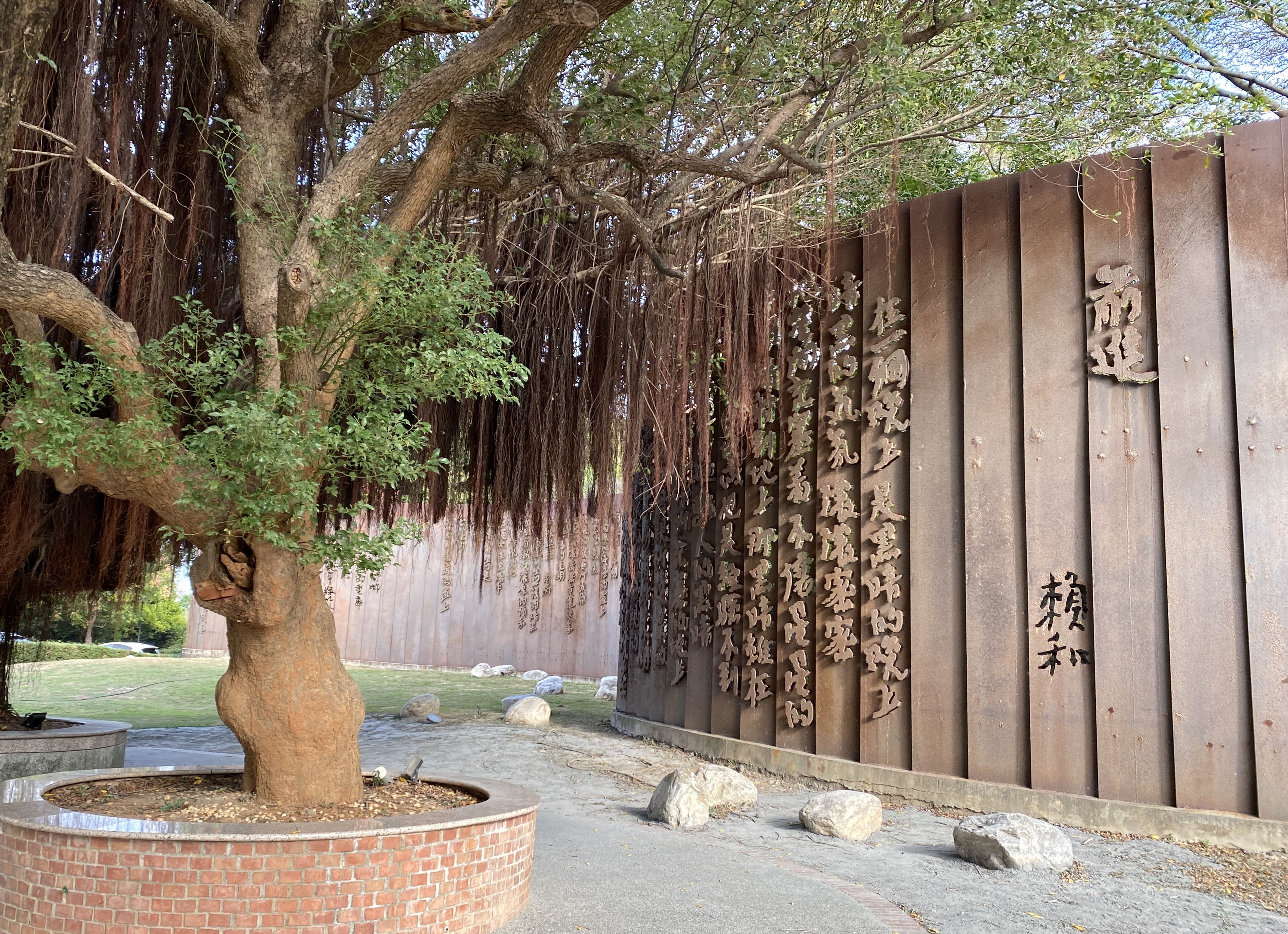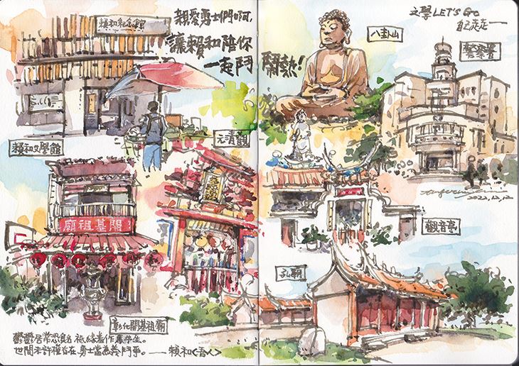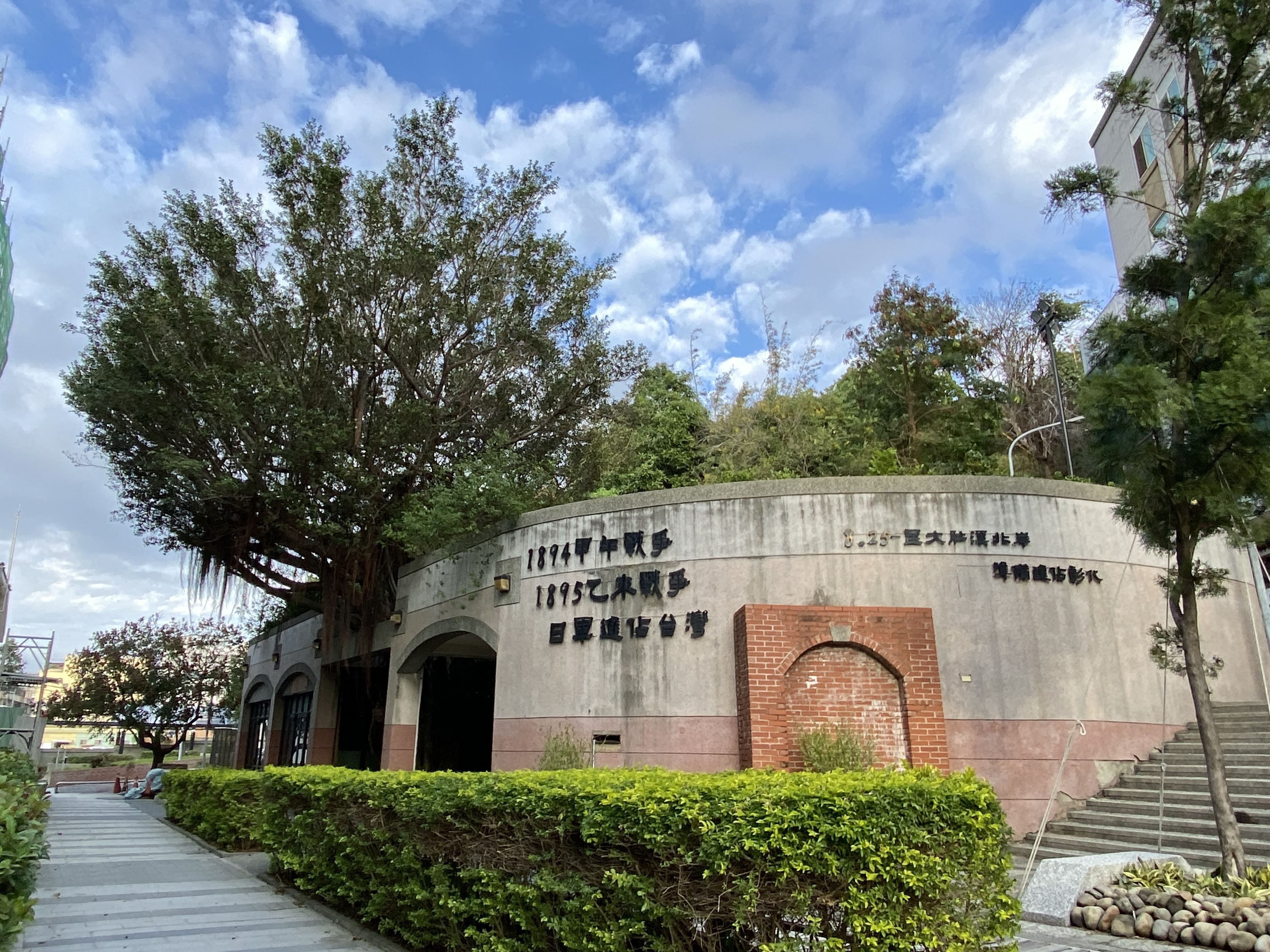 穿過八卦山牌樓,圖書館後的1895八卦山抗日保台史蹟館,由防空洞改建。喜歡建築的話附近有美術館、武德殿和彰化節孝祠,呈現不同時期的建築樣貌。接著沿著階梯緩步向上,文學步道沿路介紹彰化出身的文學家,步道盡頭來到賴和詩牆,不少人來這裡散步、運動、遛狗,也有學生來校外教學。