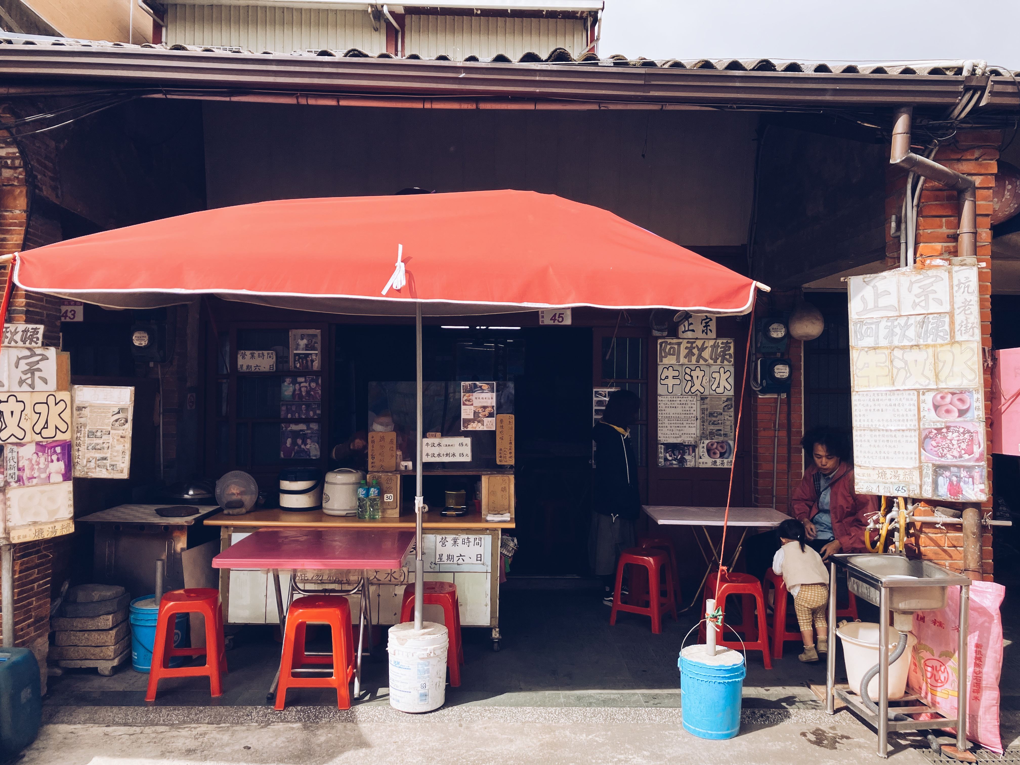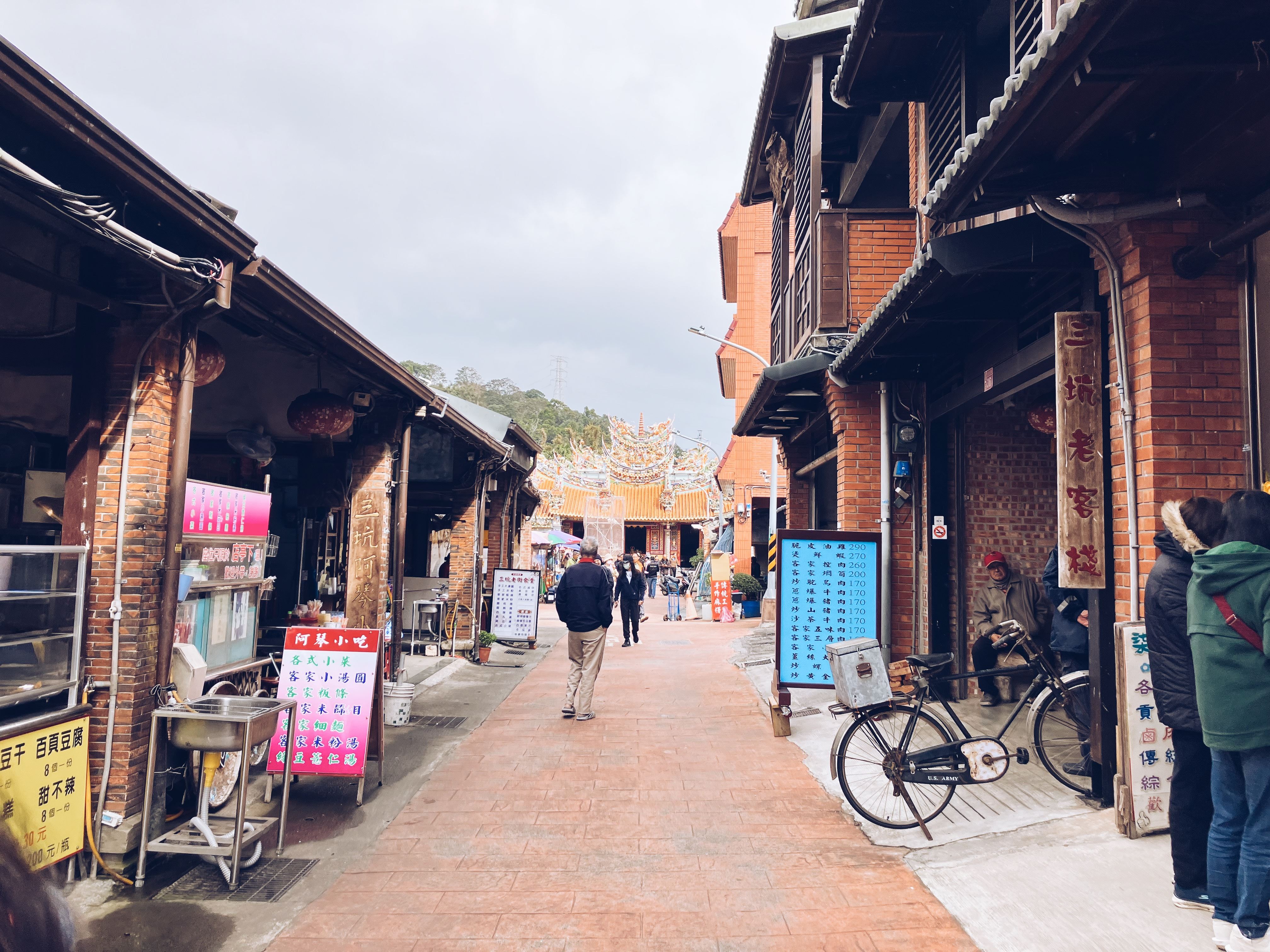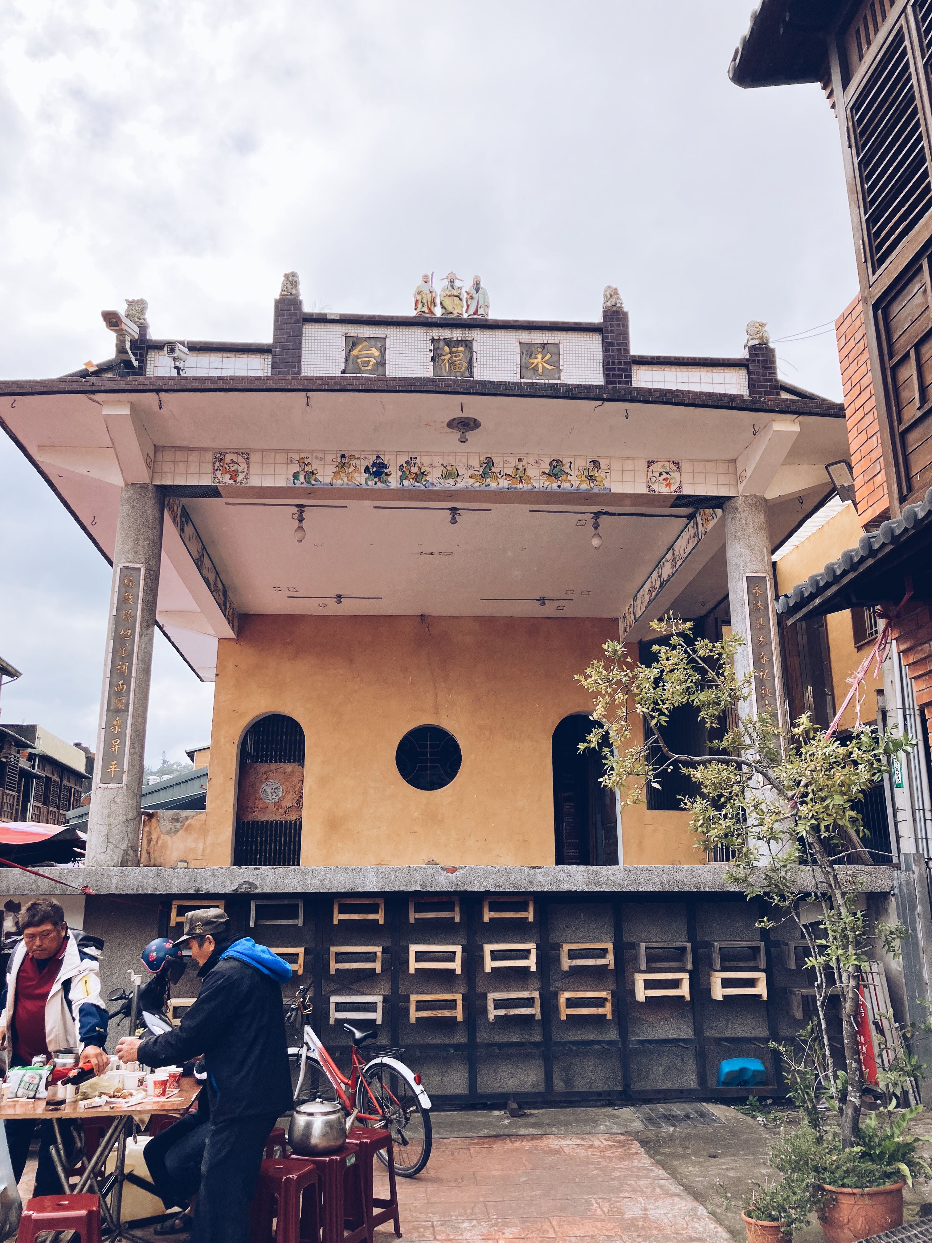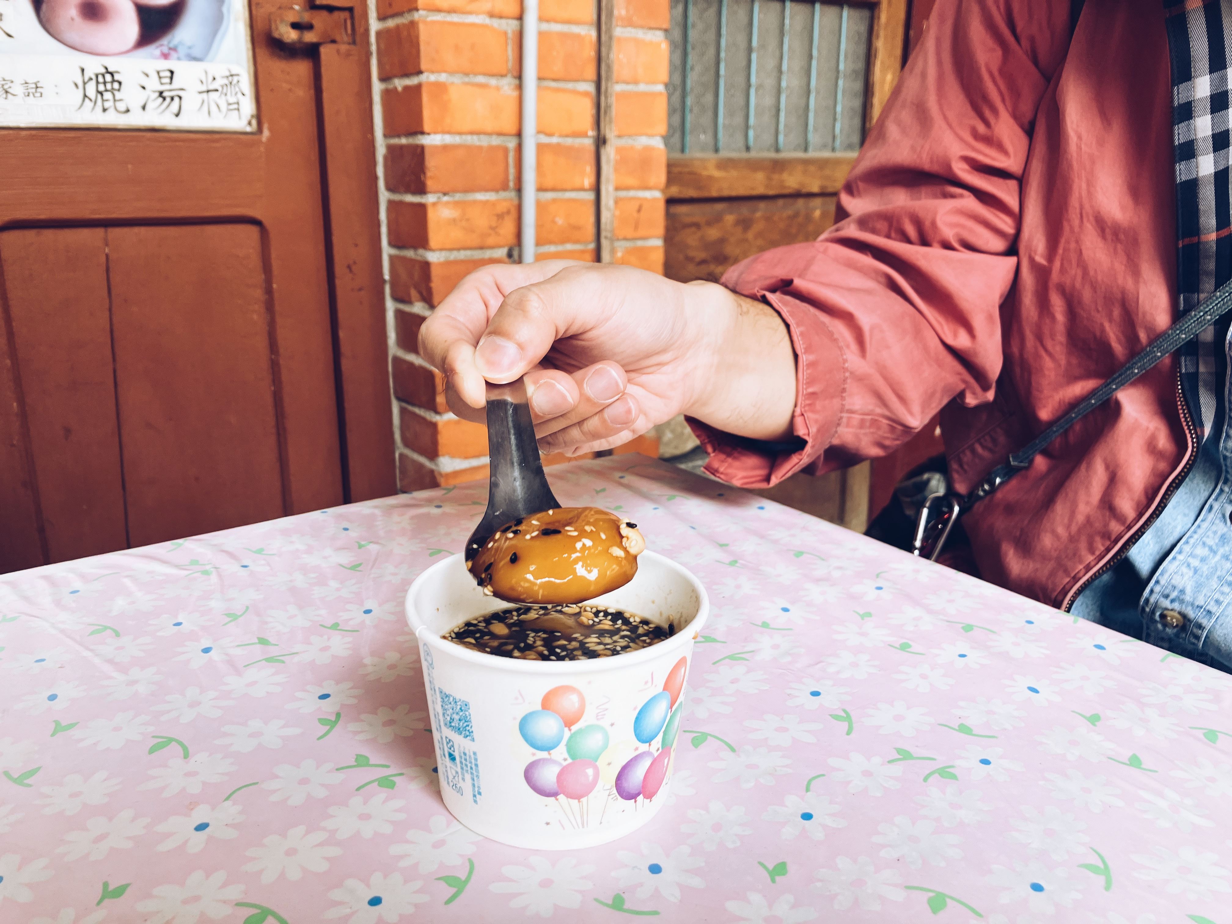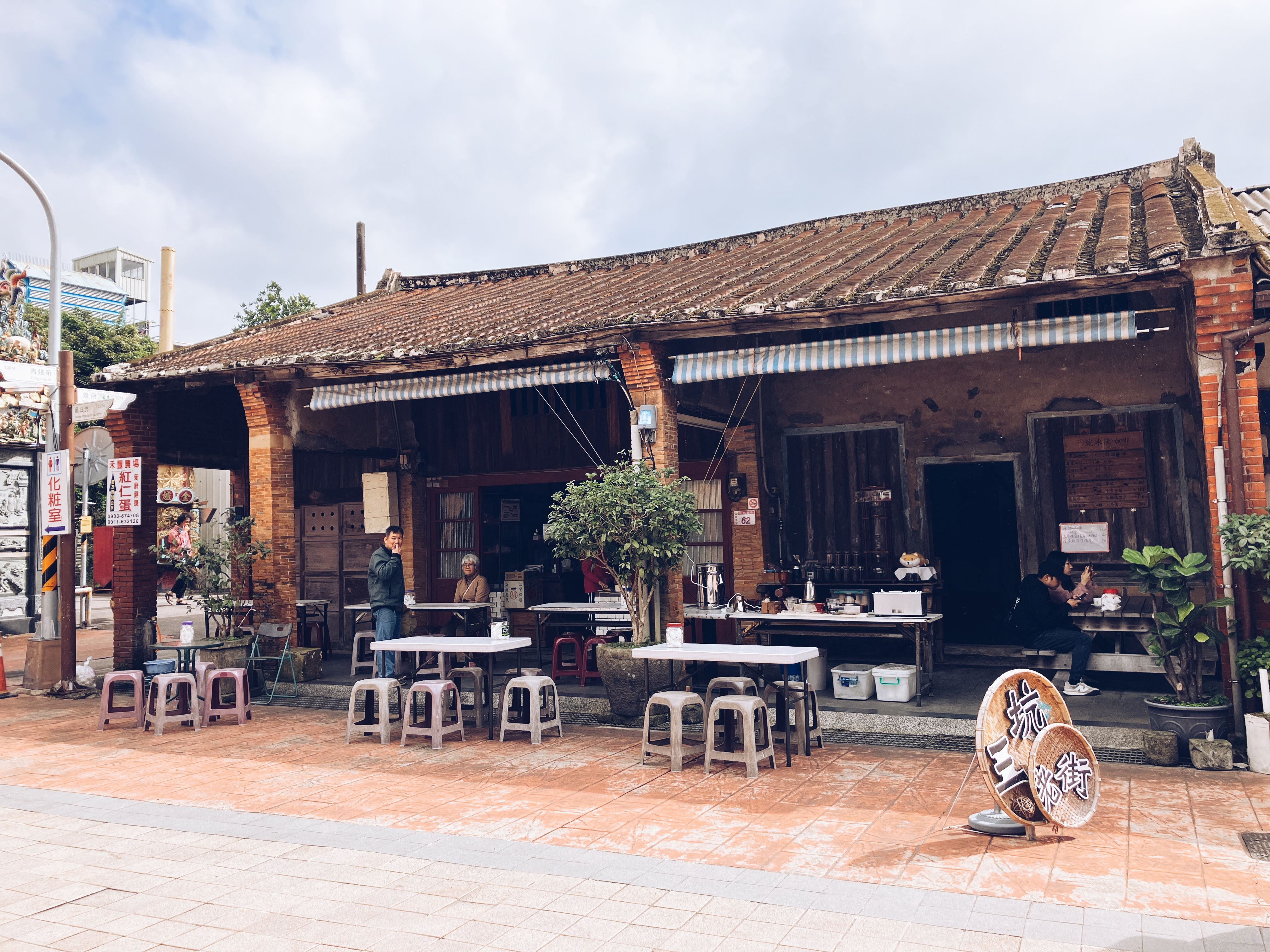 品嚐完活魚料理,來到走讀路線的另一個推薦景點——三坑老街,這裡位於大漢溪中游的河階之上,是重要的河運樞紐、地方特產集散地,也是龍潭最早開發的地區,不過後來因桃園大圳修建,地方水運的功能逐漸消失,三坑老街也就逐漸沒落。 三坑地區是鍾肇政妻子娘家的所在地,也是水圳興建時首當其衝的重要地區之一,因此可以推測這個地方對鍾肇政的創作,應該有一定的影響。雖然作品中未特別指出三坑,但在小說《大壩》和《大圳》中,描寫水利工程對當地農村的影響時,可能都包含了三坑地區當時樣貌與鄉親的反應。 實際來到三坑老街,短短的街道仍保留著舊時步廊式街屋,路邊有零星的水果、蔬菜攤販,也有人在自家門口擺著客家酸菜、桔醬、蘿蔔糕等地方常見食材,看起來簡單樸實,卻又充滿生活氣息。 雖然已經吃過活魚料理,但是來到這裡,絕對不能錯過「牛汶水」!牛汶水是一碗泡在黑糖薑汁裡的、蘸著花生芝麻的麻糬甜點,聽說是看起來就像牛隻泡在水裡,露出牛背的樣子,故稱牛汶水。它是龍潭客家人的傳統點心,在其他地方,即便是客莊也都不見得能找到,可以說是地方限定的特色甜點。 繼續往裡走,就是地方信仰中心:永福宮,來自外地的我,對於廟宇不是很熟悉,但是對面的小戲台倒是吸引了我的注意力,牆上的壁畫、屋頂的剪黏都充滿細節,戲台下還有板凳的收納,方便拿取又像是裝飾,真的是有趣的設計!