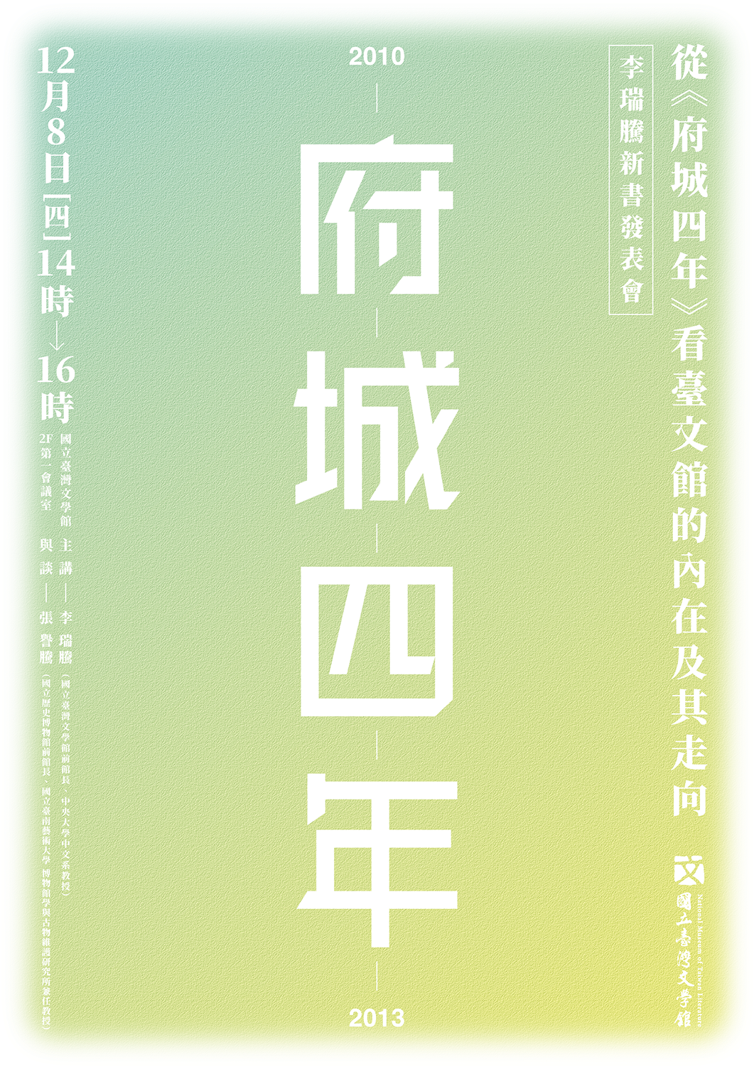 《府城四年》新書發表會回到台文館舉辦,其意義與感動不言而喻;除李教授將分享《府城四年》因緣外,亦邀請張譽騰教授一同對談。