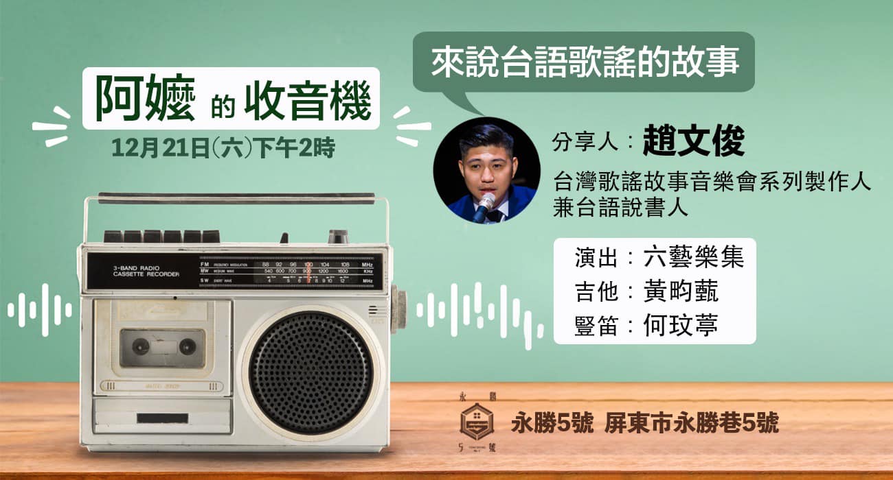 12月21日下午2時(地點在永勝5號),趙文俊老師要來書店分享台語歌謠的故事,以前採訪文俊老師時,他是直排輪老師,現在他身兼數職,不但主持台語電台節目,還爬梳地方文史、推動青年志工導覽家鄉,這次他要結合音樂,為大家帶來台語歌謠的故事,從歌曲開始,認識台語之美還有時代的故事。(活動採免費入場,請填表單:https://forms.gle/TGiqK4wegPwB4NYK6)