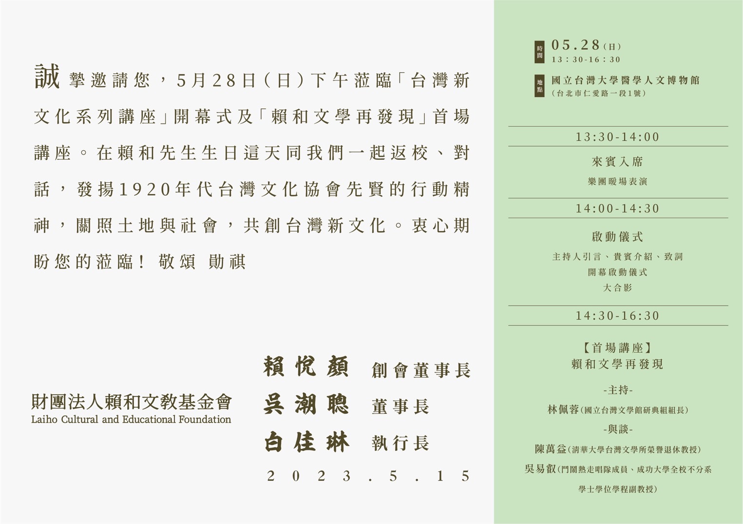 上週六由林衡哲醫師規劃、蔣渭水文化基金會主辦「文藝復興論壇系列–再造台灣新文化運動」一連13場在濟南教會的精彩講座,正式落幕;本週日5月28日,將由賴和基金會接下棒次,在賴和129歲生日這天展開「賴和教我們的事—台灣新文化系列講座」,也特地回到賴和母校今台大醫學院醫學人文館,談賴和與他的文學成就、談閱讀賴和的啟發以及當代台灣社會。