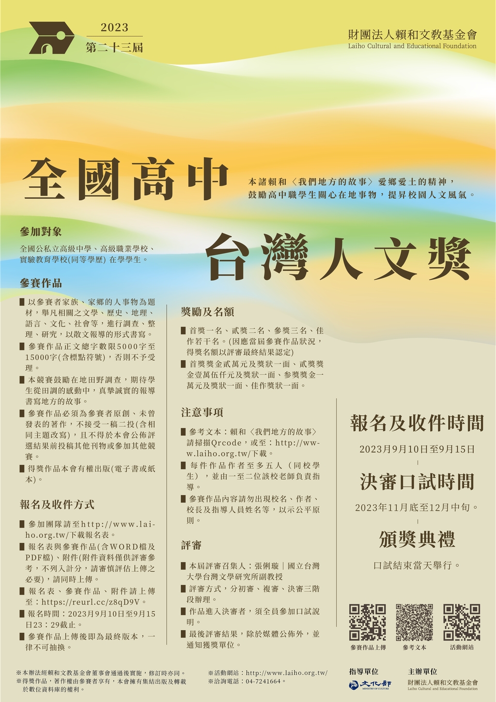 「第二十三屆全國高中臺灣人文獎」競賽辦法