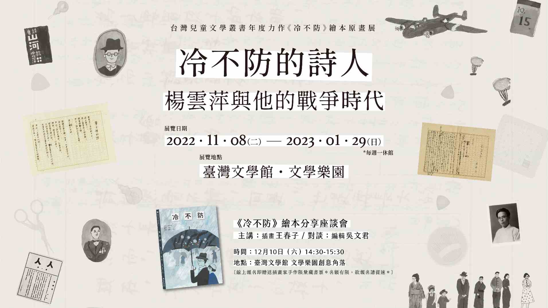 簡介:繪本《冷不防》由插畫家王春子與編輯吳文君巧手剪裁、重組詩人楊雲萍的六首詩:〈風雨中〉、〈冷不防〉、〈裏巷黃昏〉、〈市場〉、〈菊花〉、〈鳥〉而成。並由王春子發揮想像,以童趣插畫描繪出戰爭時期,人們倉皇躲避戰火的心境,以及時代變動的感傷。本展覽展出6幅《冷不防》繪本原畫,邀請大家一同品味詩人與畫家筆下跨越時空的精彩對話。