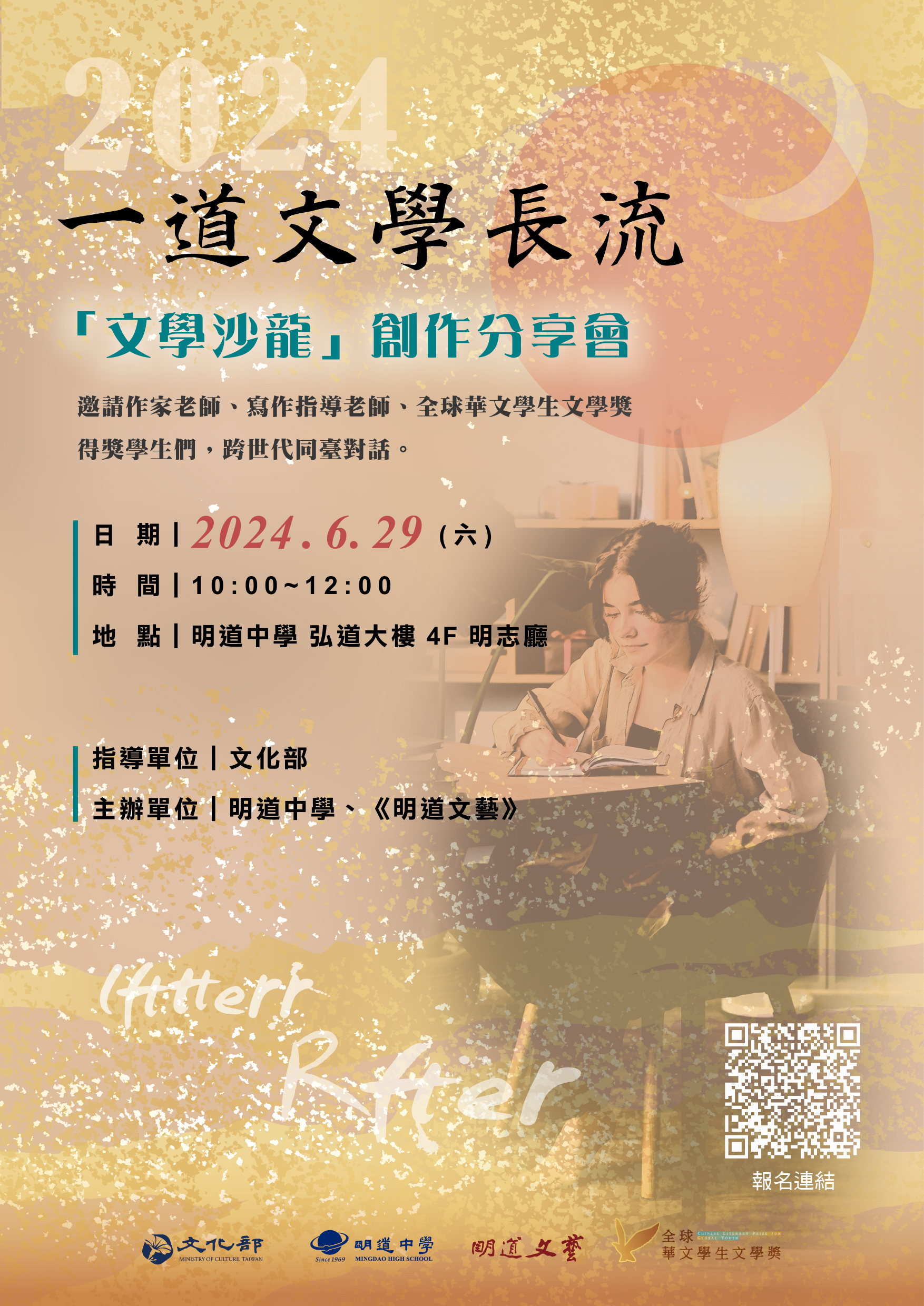 邀請全國喜愛文學創作的同好,一起參加「一道文學長流」文學沙龍座談會,當天將邀請知名文學作家大師分享給青年學子最實用的創作心法與技法。