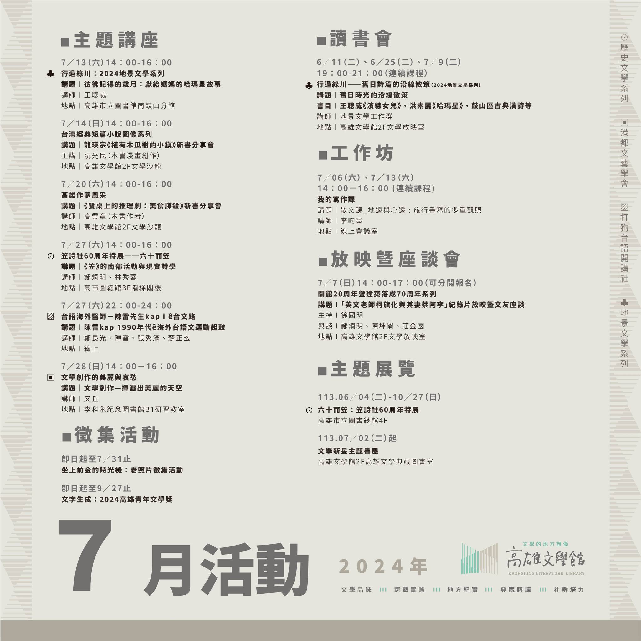 【七月活動】#開館20周年暨建築落成70年 #高雄作家風采 #老照片徵集 #高雄青年文學獎 #文學創作的美麗與哀愁 #地景文學系列 #笠詩社60周年