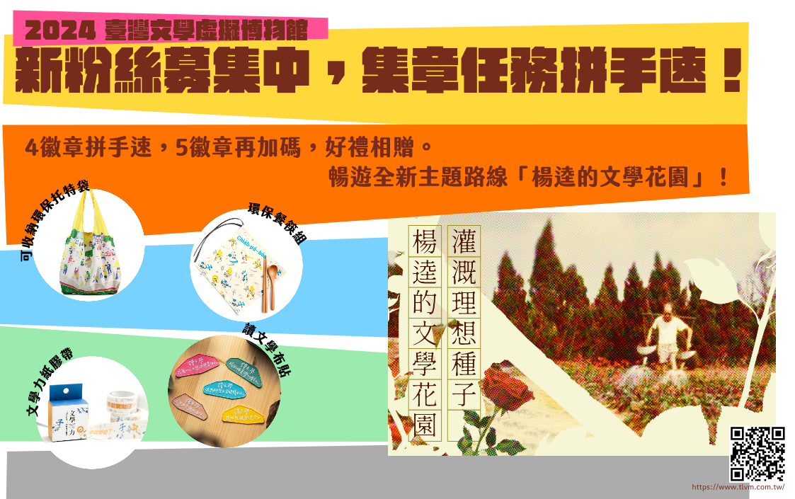 2024年臺灣文學虛擬博物館新粉絲募集中!集章任務拼手速,最快集滿4個徽章,可換獎品一份(限量20名),最快集滿5個徽章的10名新粉絲,還可以獲得額外好禮!