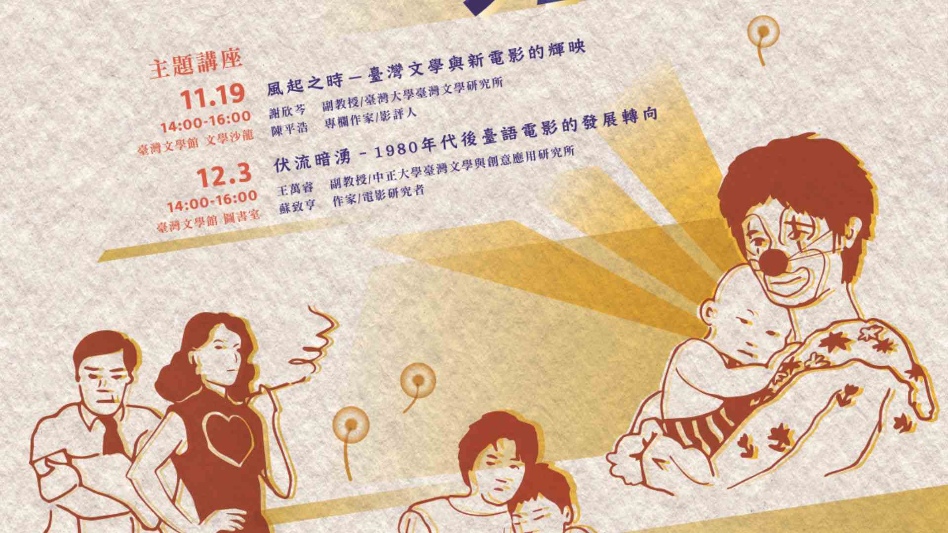 再新電影出發的時候:臺灣新電影四十年回顧展系列活動   2022年是影響臺灣電影發展深遠的新電影肇始40周年,國家電影及視聽文化中心特別規劃「再新電影出發的時候」系列活動,重新觀看這段短暫而燦美的新電影時期的作品。臺灣文學館也從文學改編與電影的連結,合作辦理「從土地揚起的風潮—臺灣文學與新電影」主題講座與書展講座,從多元日常生活、個人文學記憶中召喚時代的記憶,擴大文學閱讀與視覺影像的連結與視界。透過文學改編與影像作品的連結,重新回望80年代臺灣文學與新電影的風貌。 「從土地揚起的風潮—臺灣文學與新電影」主題講座 第一場:風起之時—臺灣文學與新電影的輝映            主講人|謝欣芩  臺灣大學臺灣文學研究所副教授                     陳平浩  專欄作家/影評人        日期|11月19日(六)14:00~16:00         地點|臺文館1F文學沙龍   第二場:伏流暗湧—1980年代後臺語電影的發展轉向     主講人|王萬睿  中正大學臺灣文學與創意應用研究所副教授                    蘇致亨  作家/電影研究者        日期|12月  3日(六)14:00~16:00         地點|臺文館B1圖書室        報名連結