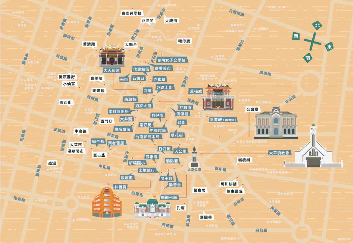 臺南州廳(國立臺灣文學館)→大正公園(湯德章紀念公園)→消防署(臺南合同廳舍)→太平境教會→公會堂(吳園)→(途經葫蘆巷至)大天后宮→葉老舊居→(途經銀座通至)林百貨→度小月擔仔麵→原臺南警察署(美術館)→孔子廟